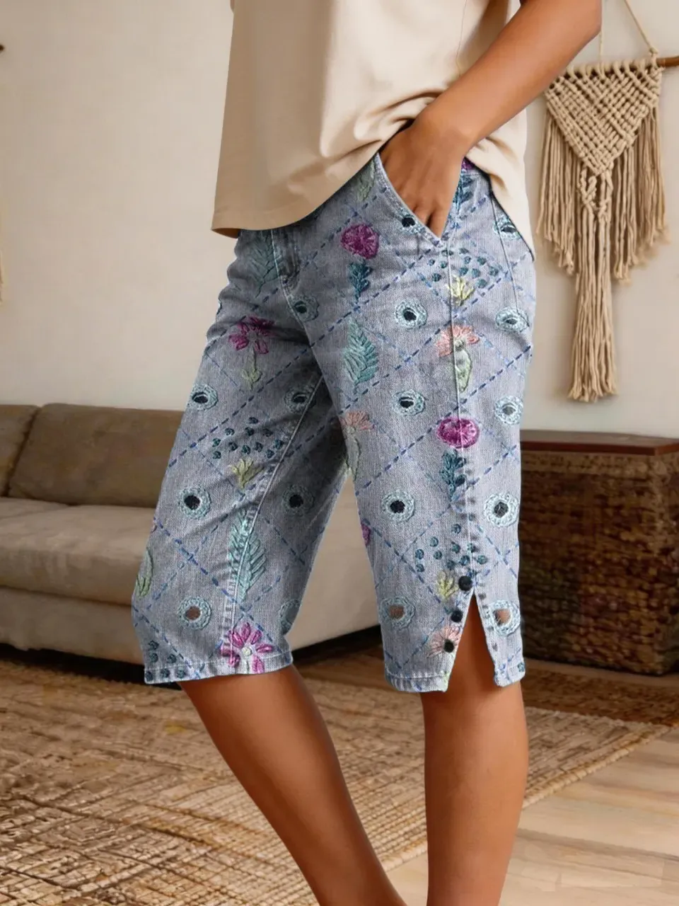 Women's Retro Patchwork Textured Floral Art Print Casual Denim Shorts
