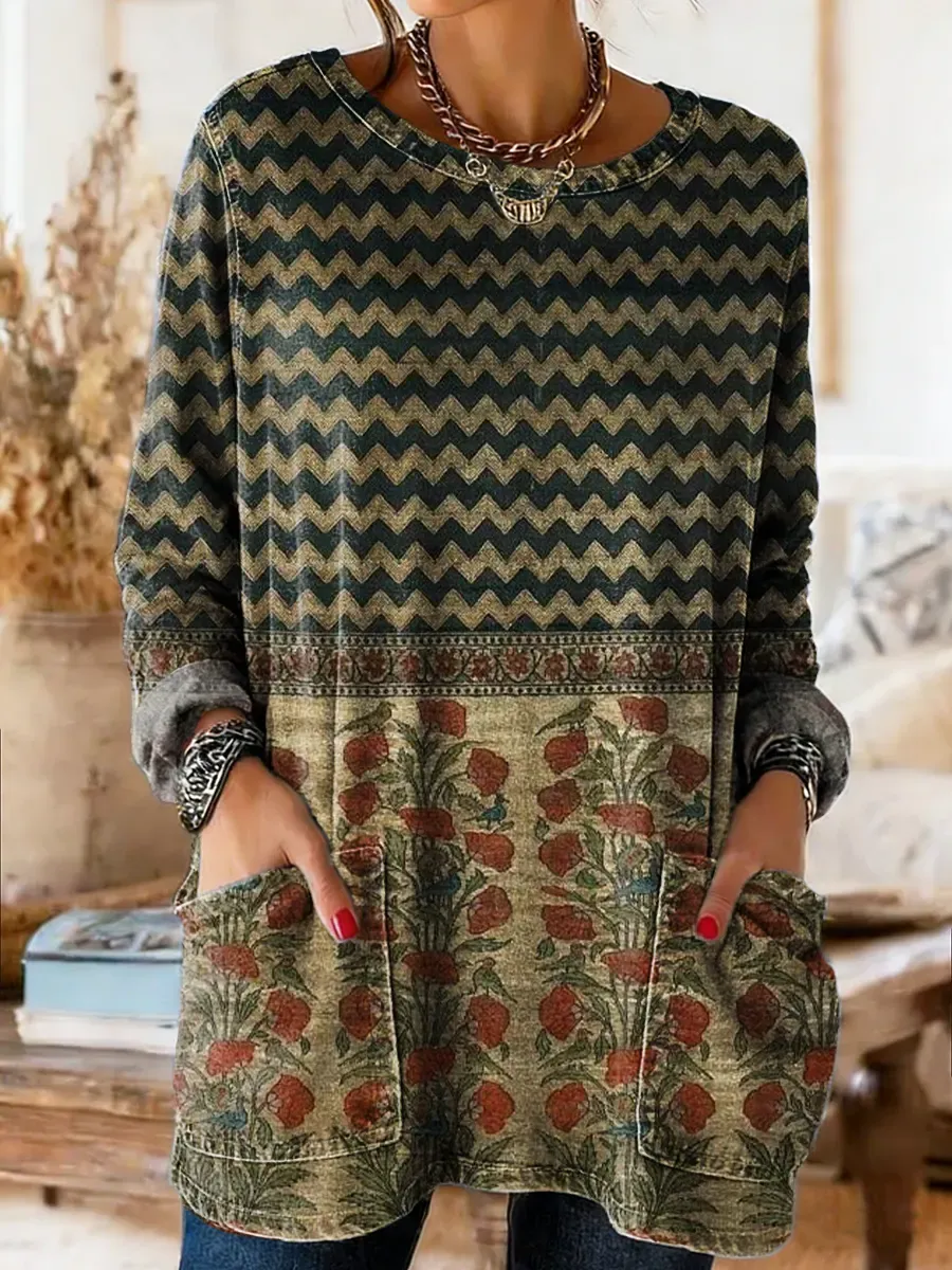 Bohemian Vintage Ethnic Floral Art Print Casual Washed Denim Cotton Top