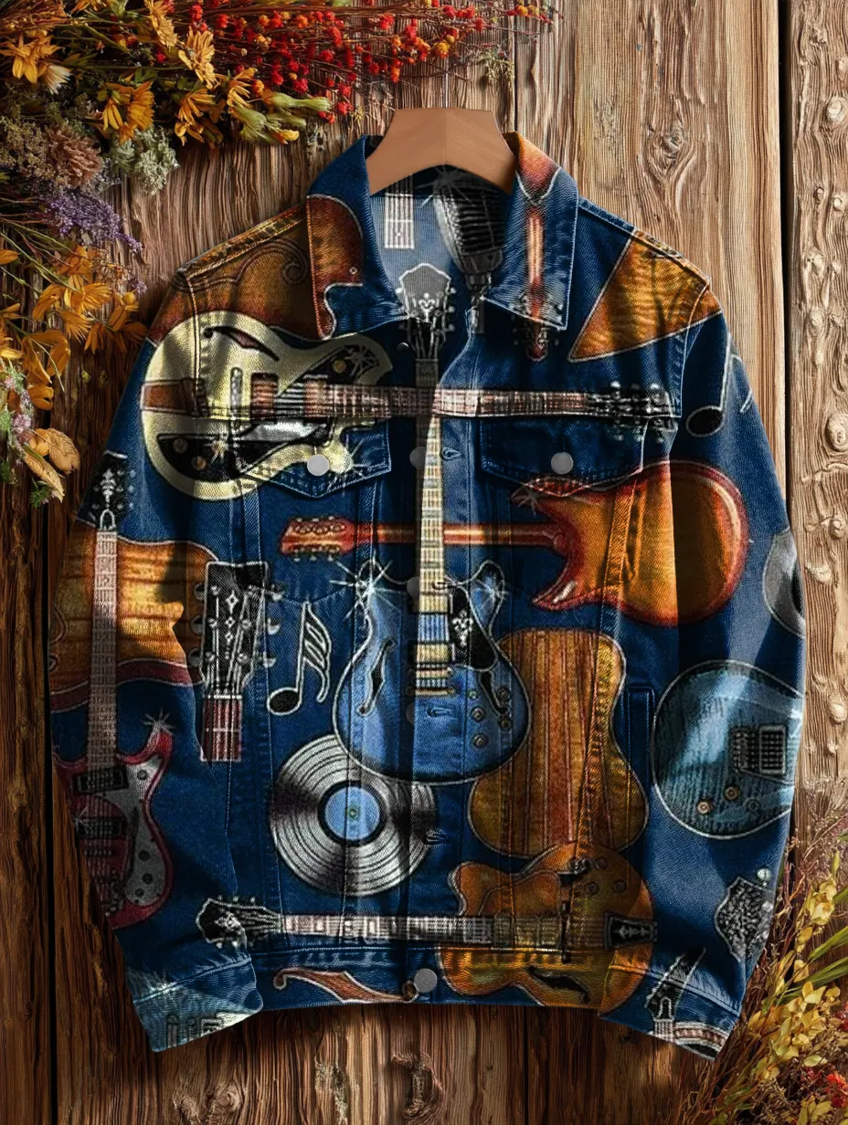 Unisex Vintage Blue Guitar Art Print Casual Denim Jacket