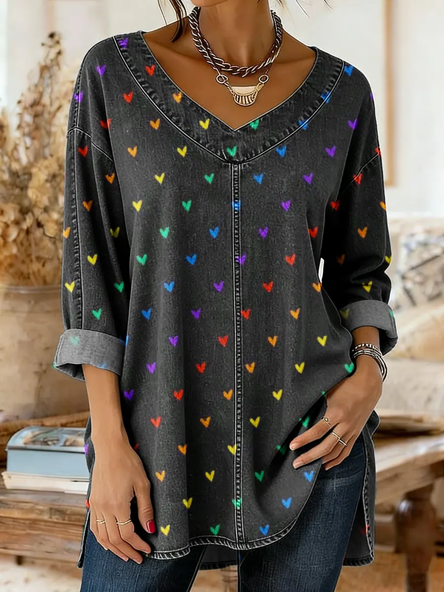 Valentine's Day Heart Print Casual Washed Denim Cotton Top