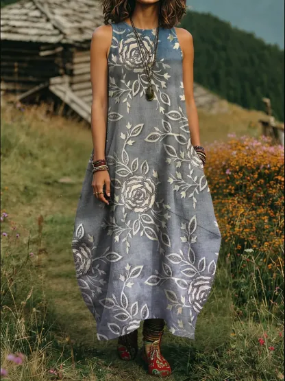 Women's Floral Art Print Round Neck Sleeveless Cotton Pocket Dress