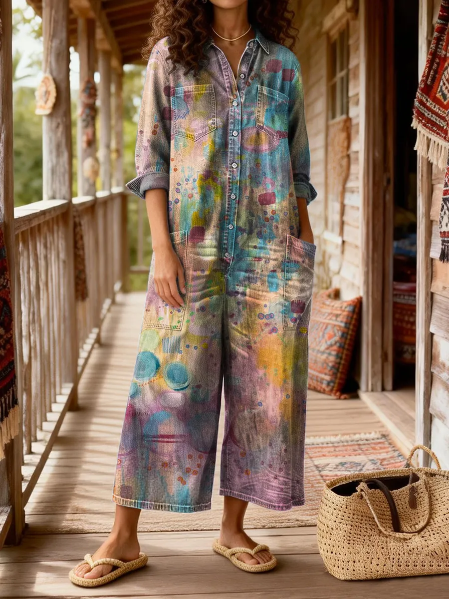 Women's Retro Art Print Casual Washed Cotton Denim Pocket Jumpsuit