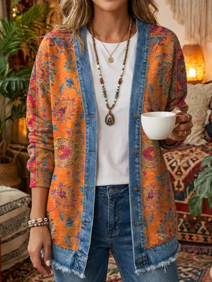 Women's Retro Ethnic Art Print Casual Washed Cotton Denim Cardigan Coat