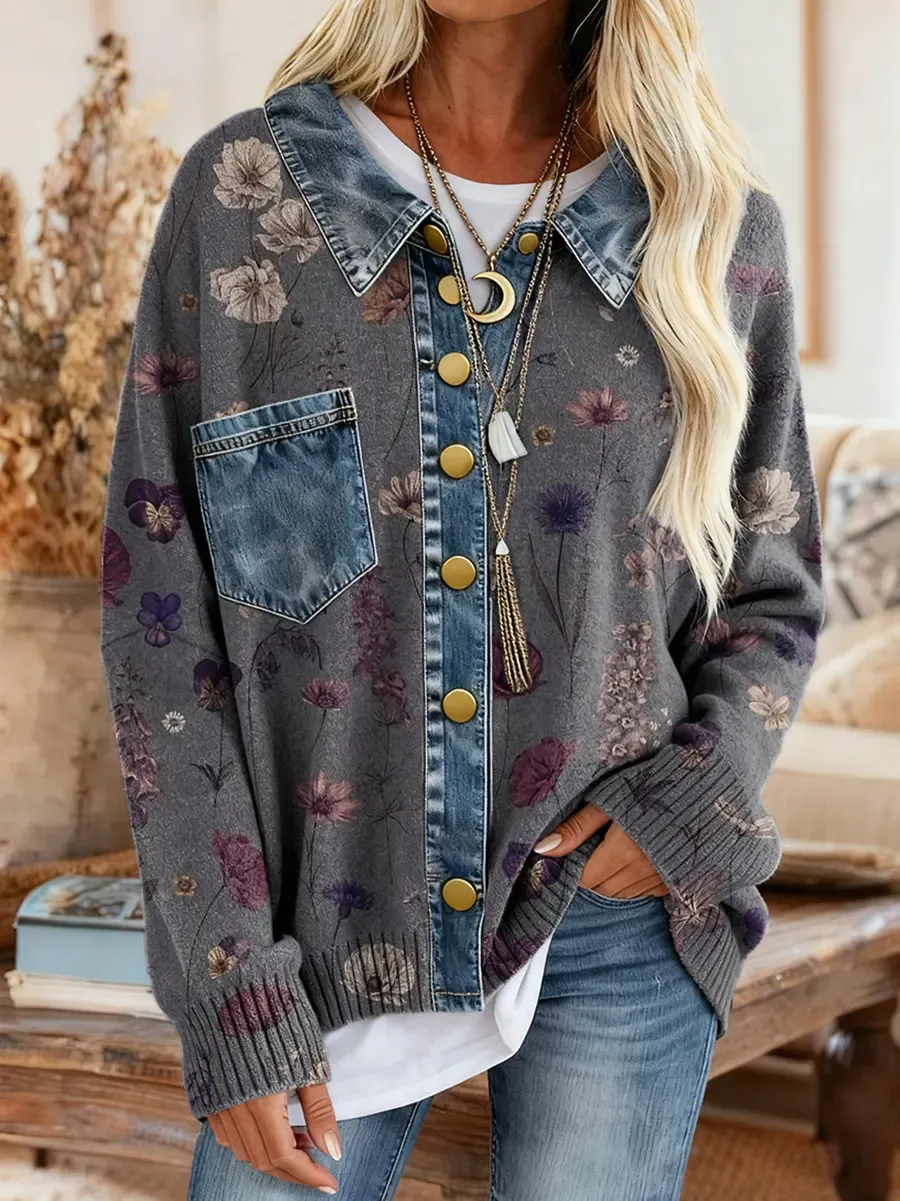 Women's Retro Floral Art Print Comfortable Denim Patchwork Knit Sweater