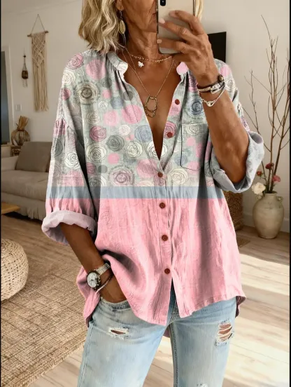 Women's Retro Rose Floral Art Print Casual Cotton Linen Shirt
