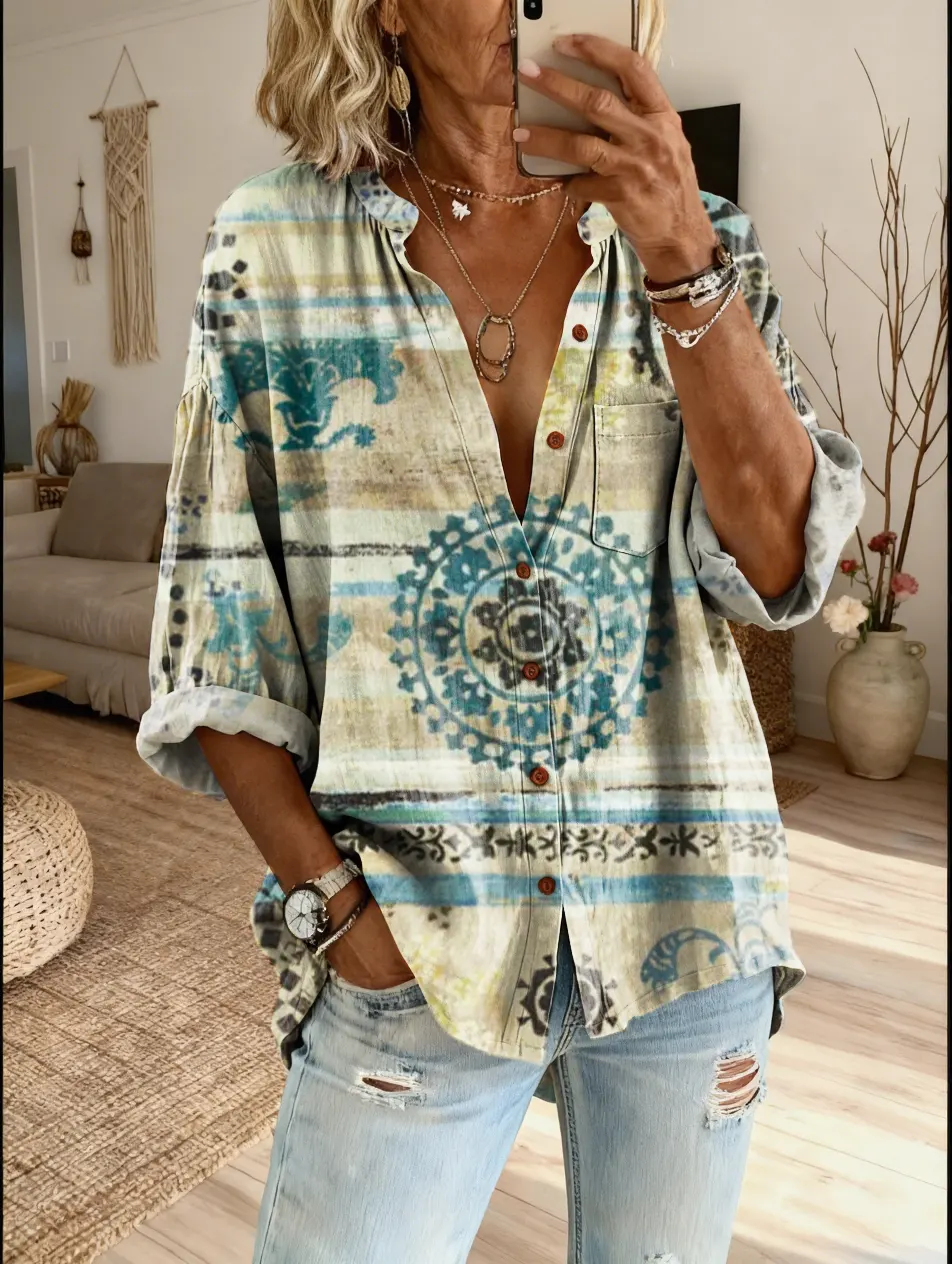 Women's Retro Totem Ethnic Floral Art Print Casual Cotton Linen Shirt