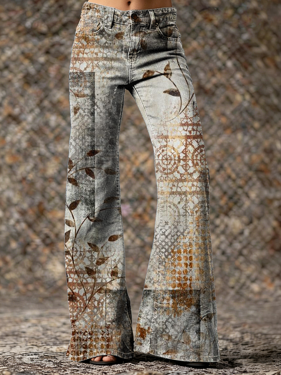 Women's Vintage Ethnic Collage Pattern Hippie Art Printed Casual Slim Denim Flared Pants