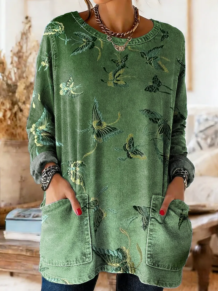 Women's Vintage Ethnic Green Gradient Butterfly Art Print Casual Round Neck Denim Shirt
