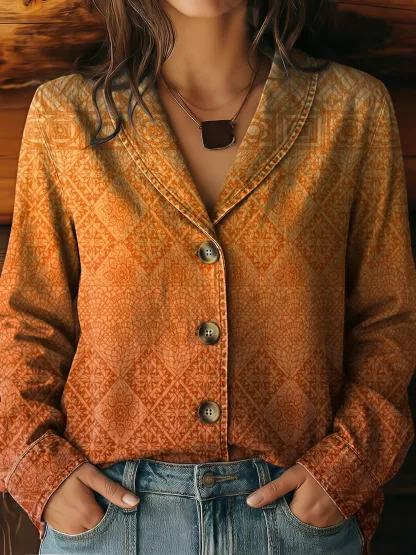 Women's Vintage Gradient Ethnic Floral Art Print Lapel Washed Denim Cotton Shirt