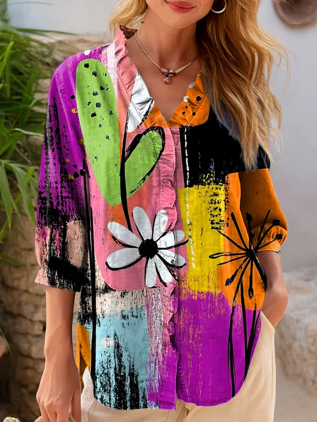 Women's Vintage Love Heart Flower Graffiti Art Print Casual Ruffle Button Denim Shirt