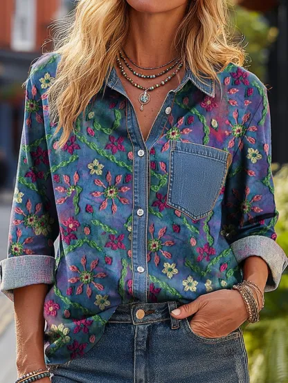Women's Vintage Purple Gradient Floral Art Print Casual Cotton Shirt With Denim Pockets