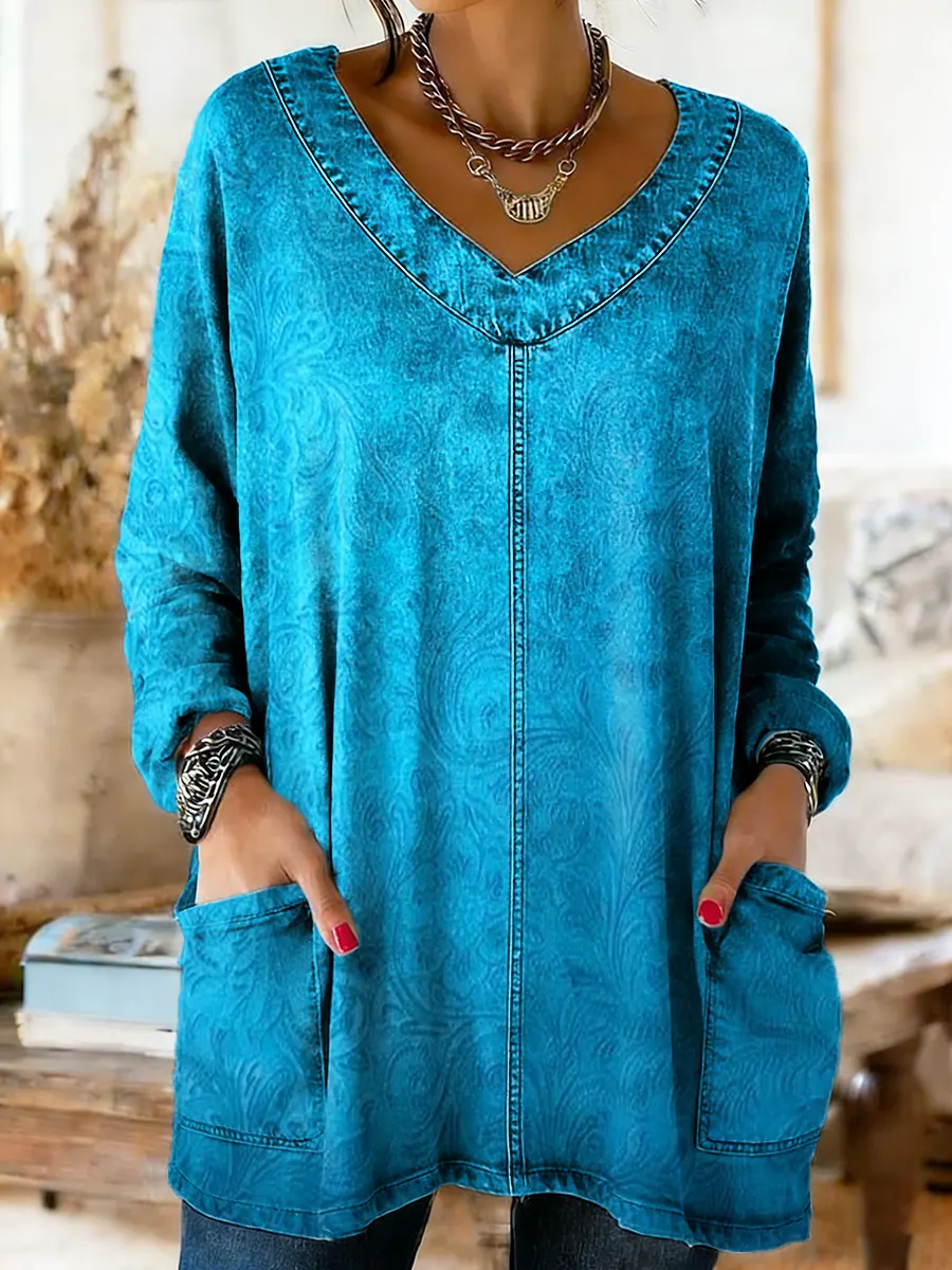 Women's Floral Art Print Long-Sleeve V-Neck Pocket Washed Cotton Denim T-Shirt