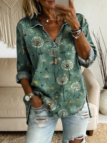 Women's Retro Dandelion Floral Art Print Casual Long-sleeved Shirt Collar Top