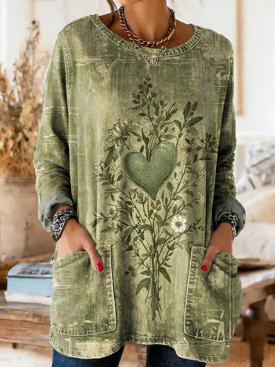 Women's Vintage Green Heart Floral Art Print Casual Round Neck Denim Shirt