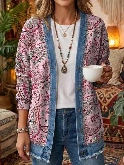 Women's Vintage Pink Paisley Floral Art Print Casual Long-sleeved Shirt/jacket