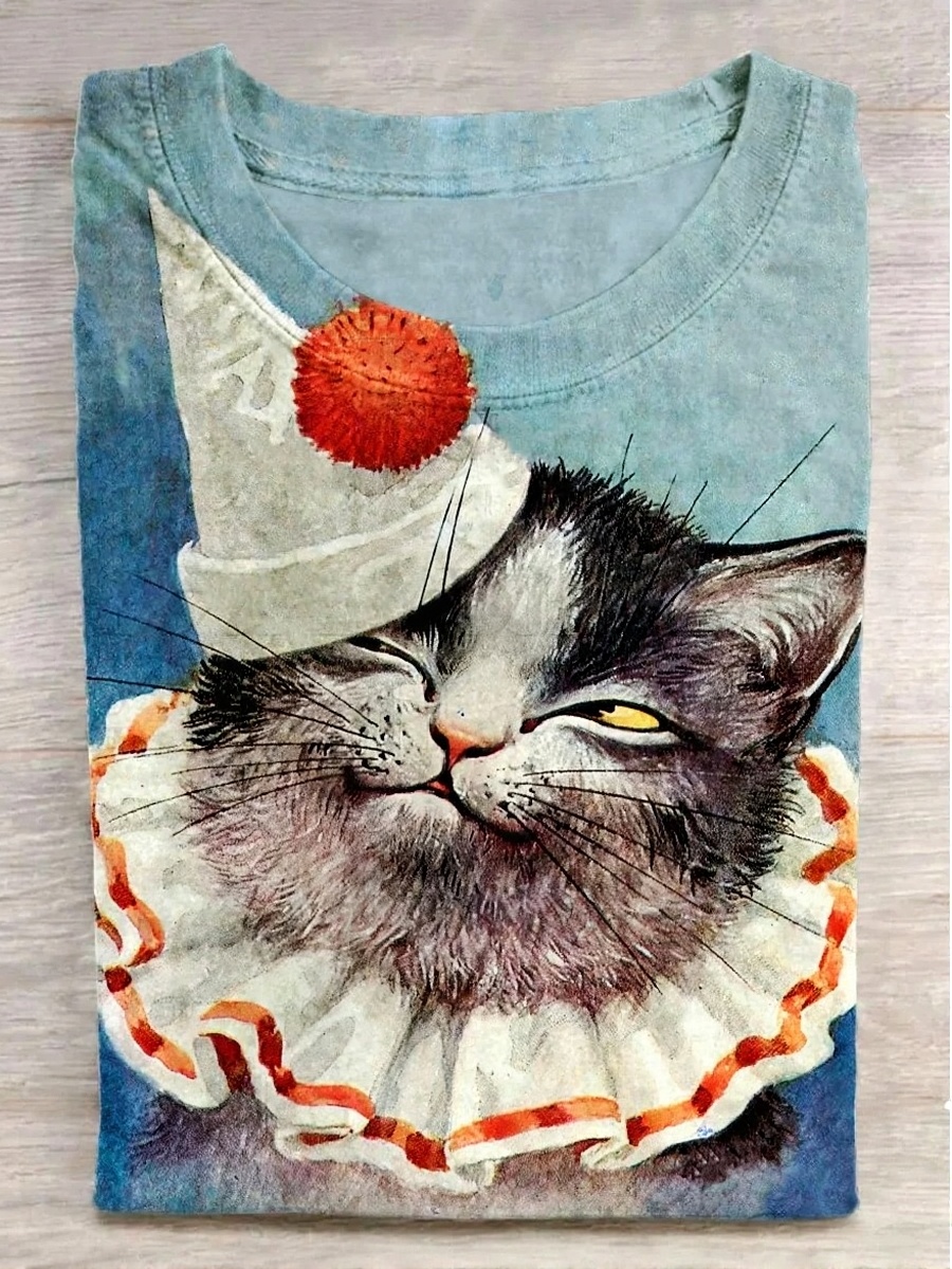 Carnival Fun Kitten Print Round Neck Short Sleeve T-Shirt