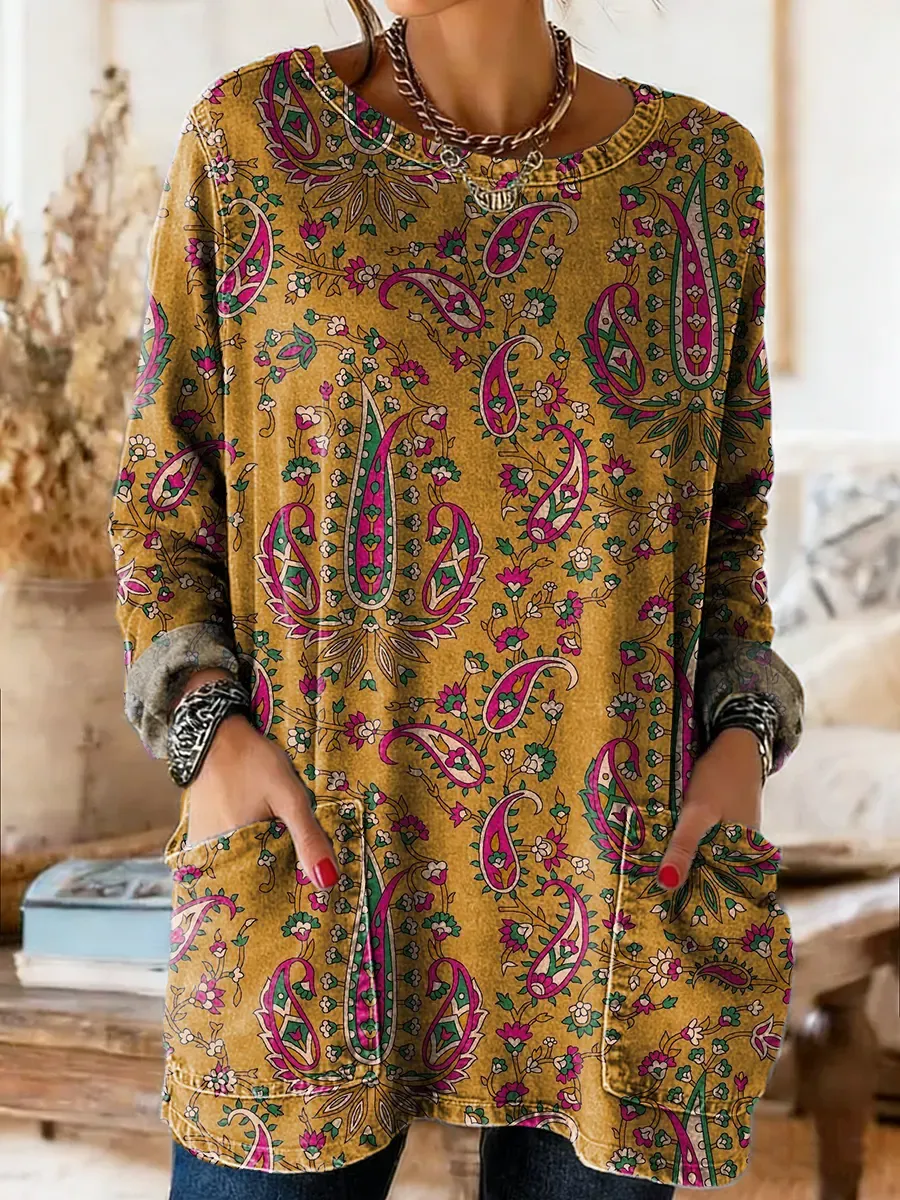 Ethnicity Paisley Flowers Women's Casual Long-sleeve Crew Neck Pocket Washed Cotton Denim T-shirt