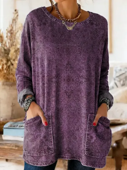 Ethnicity Purple Totem Women's Casual Long-sleeve Crew Neck Pocket Washed Cotton Denim T-shirt
