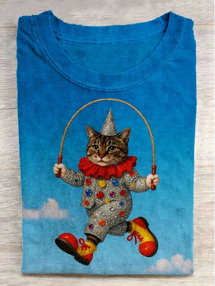 Fun Mardi Gras Kitten Print Round Neck Short Sleeve T-Shirt