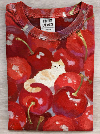 Funny Cute Cherry Cat Art Print Casual Cotton Short Sleeve T-shirt