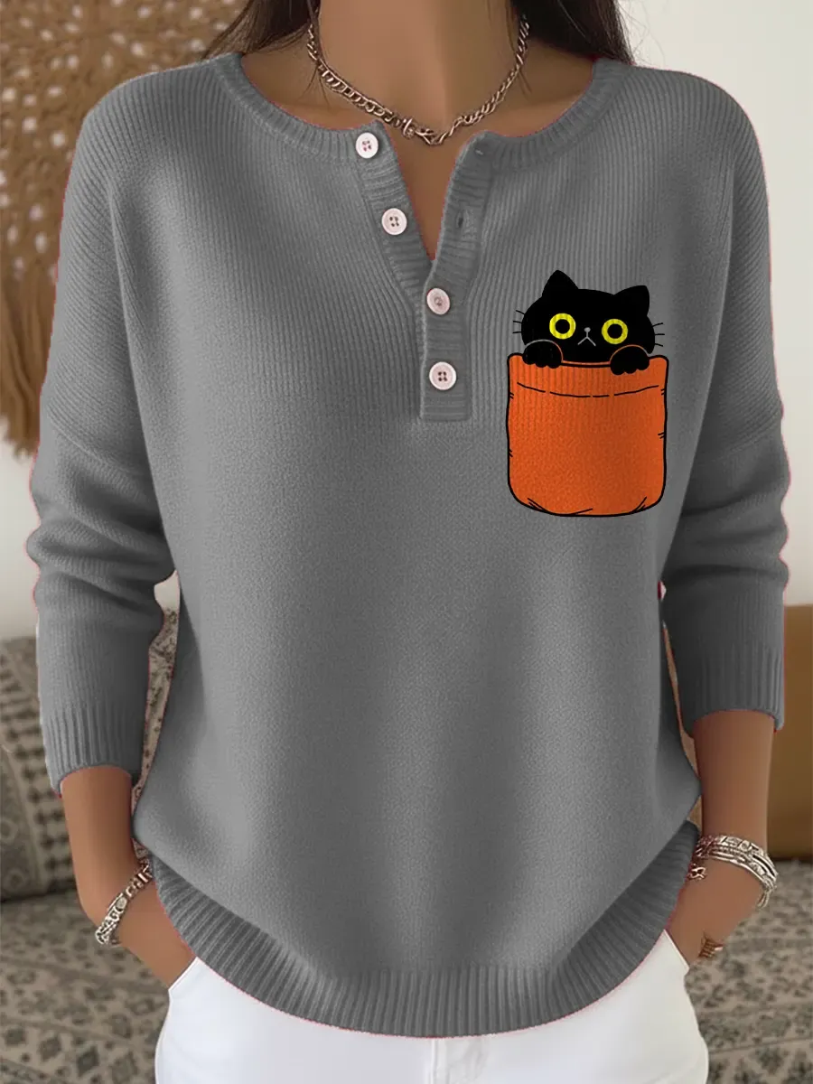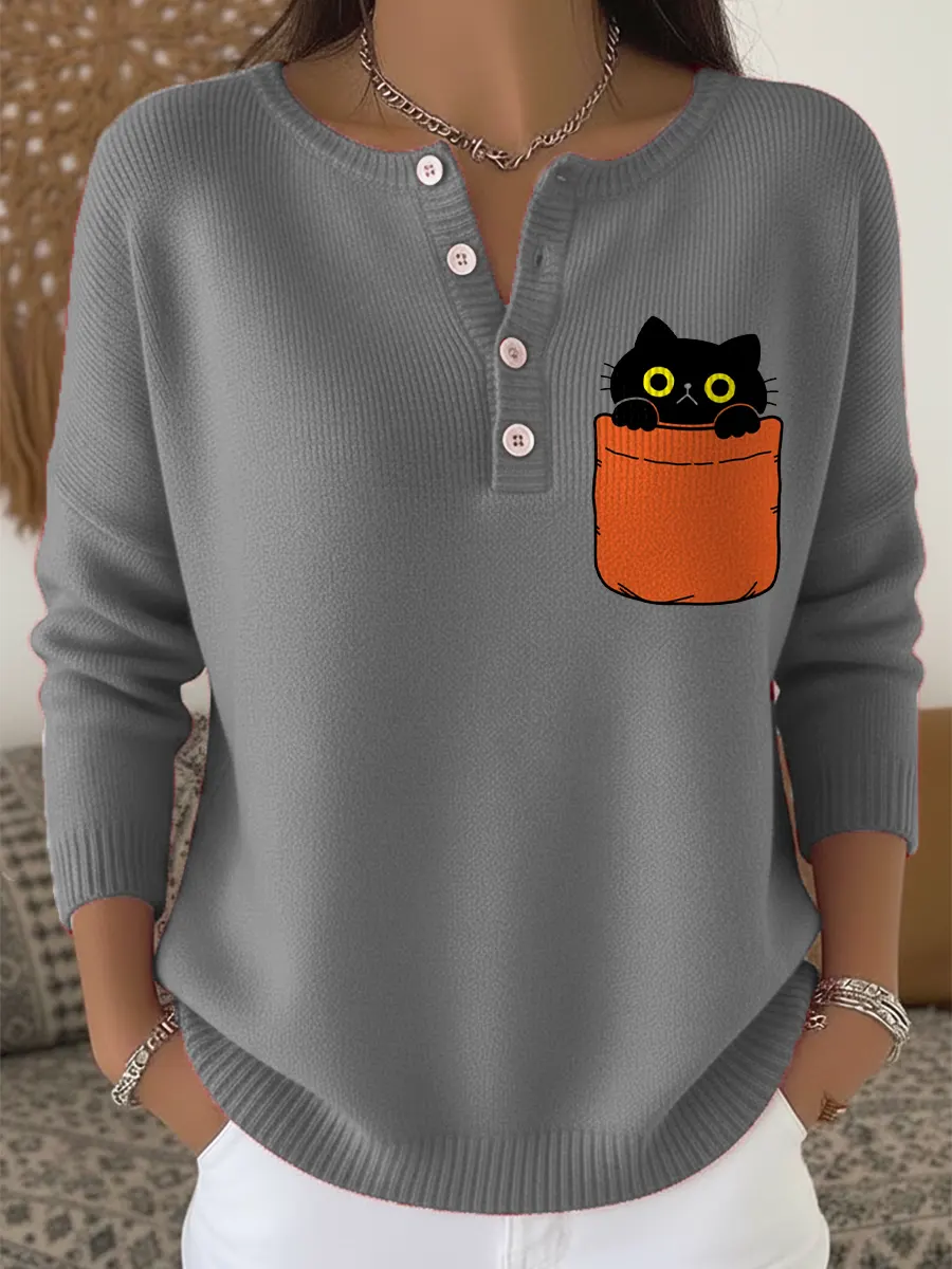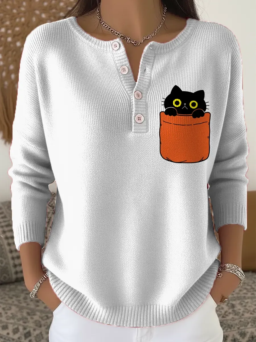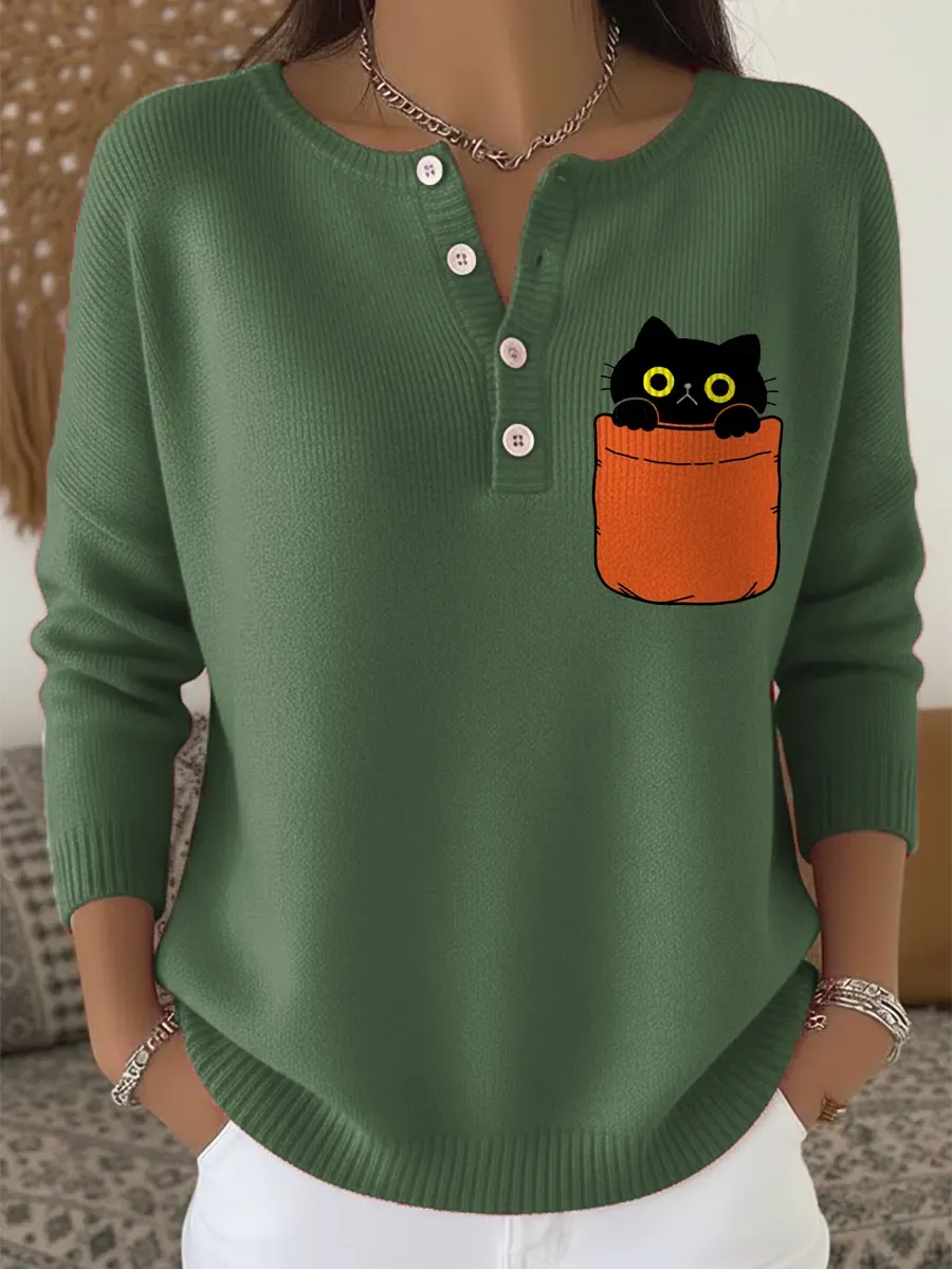 Pocket Cat Cute Vintage Art Print Buttoned Cardigan Sweater