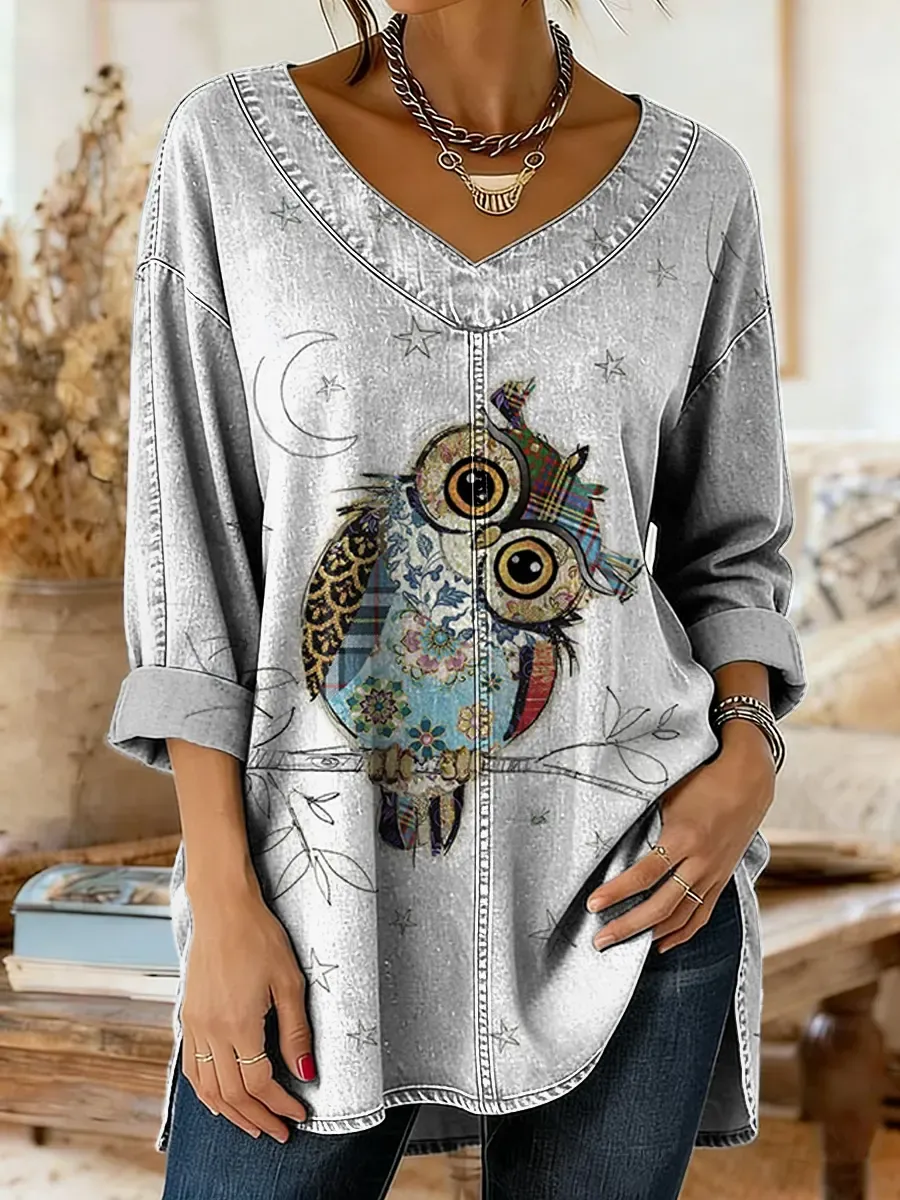 Women's Art Print Denim Pants With Owl Pattern