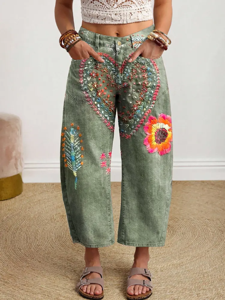 Women's Bohemian Style Heart Floral Art Print Denim Jeans