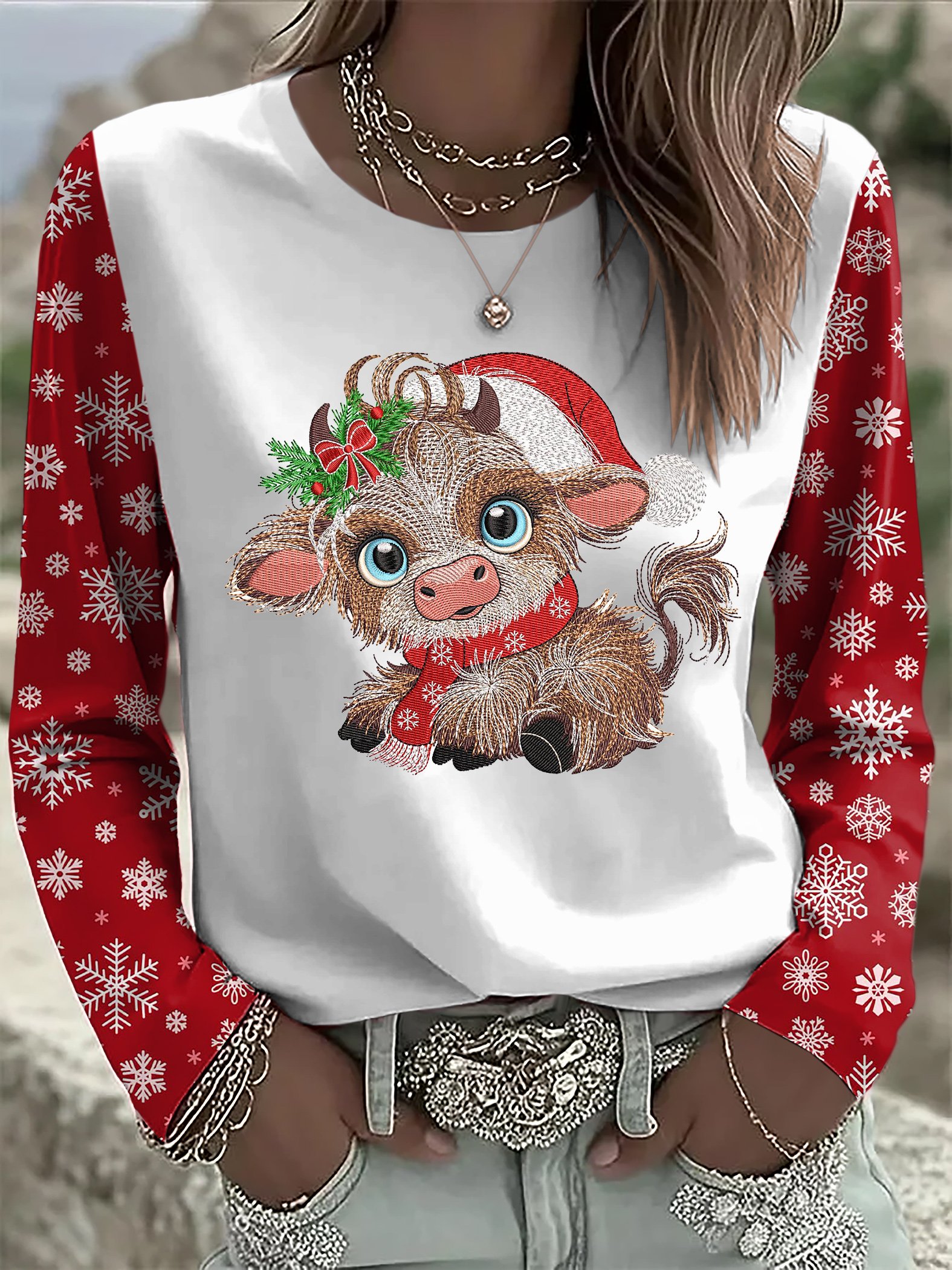 Women's casual Christmas highland yak long-sleeved T-shirt