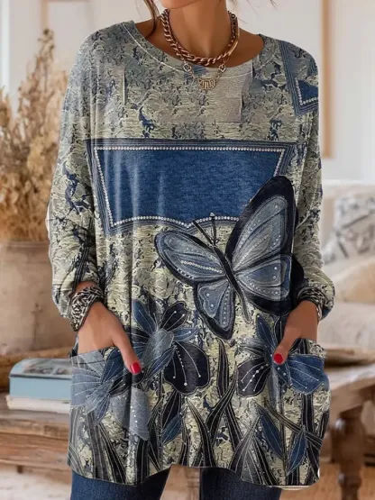 Women's Denim-Washed Butterfly Floral Art Print Casual Long-Sleeve T-Shirt