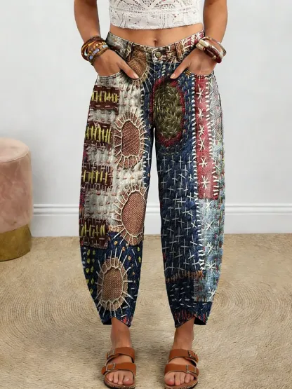Women's Ethnic Patchwork Art Print Casual Denim Cotton Pants