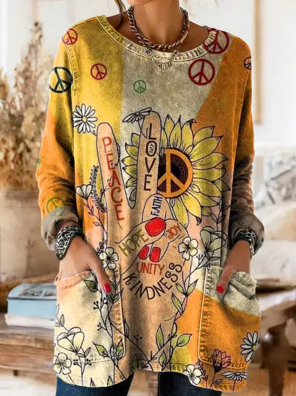 Women's Hippie Spirit Art Print Casual Long-sleeve Crew Neck Pocket Cotton Denim T-shirt