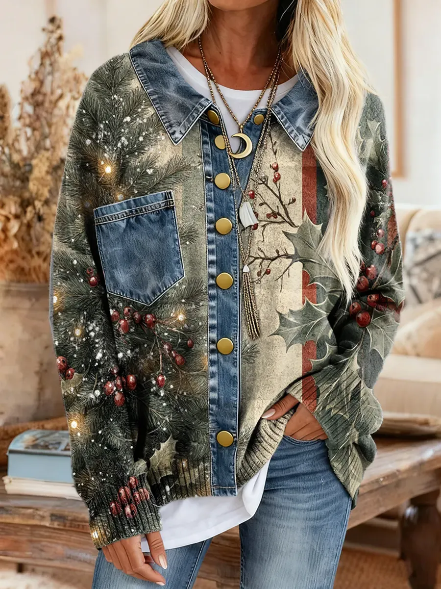 Women's Retro Christmas Tree Art Print Comfortable Denim Patchwork Knit Sweater