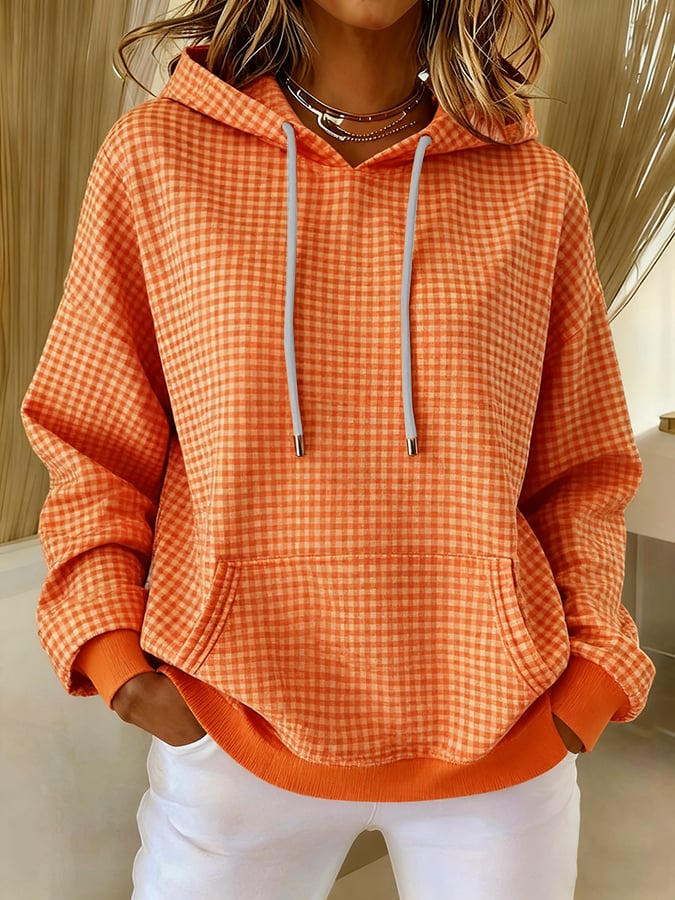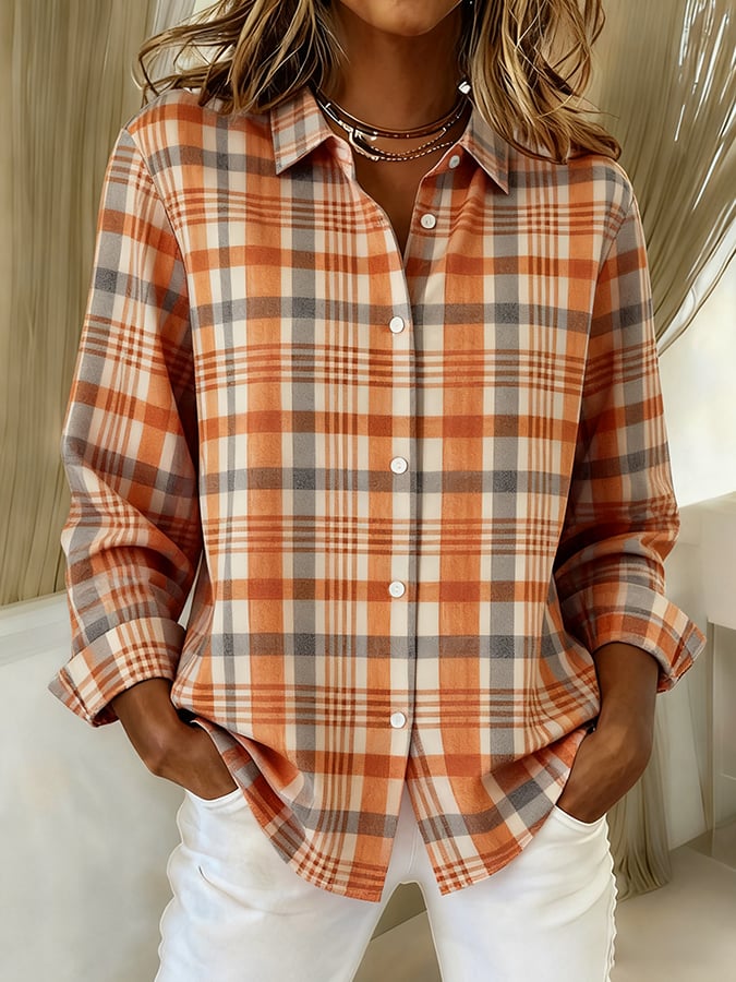 Women's Casual Retro Orange Plaid Cotton And Linen Shirt