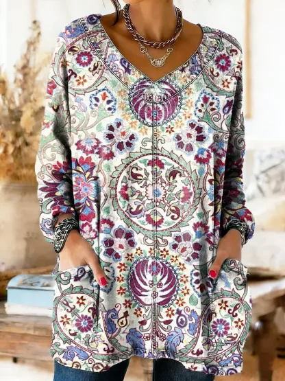 Ethnicity Totem Geometry Women's Art Print Casual Pocket Washed Denim Cotton Top