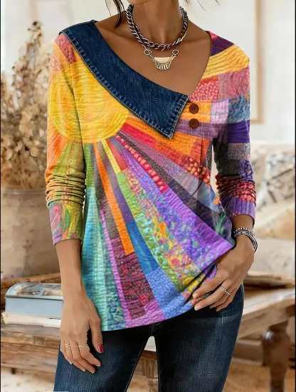 Women's Colorful Bohemian Sun Patchwork Pattern Art Print Denim Collared Top