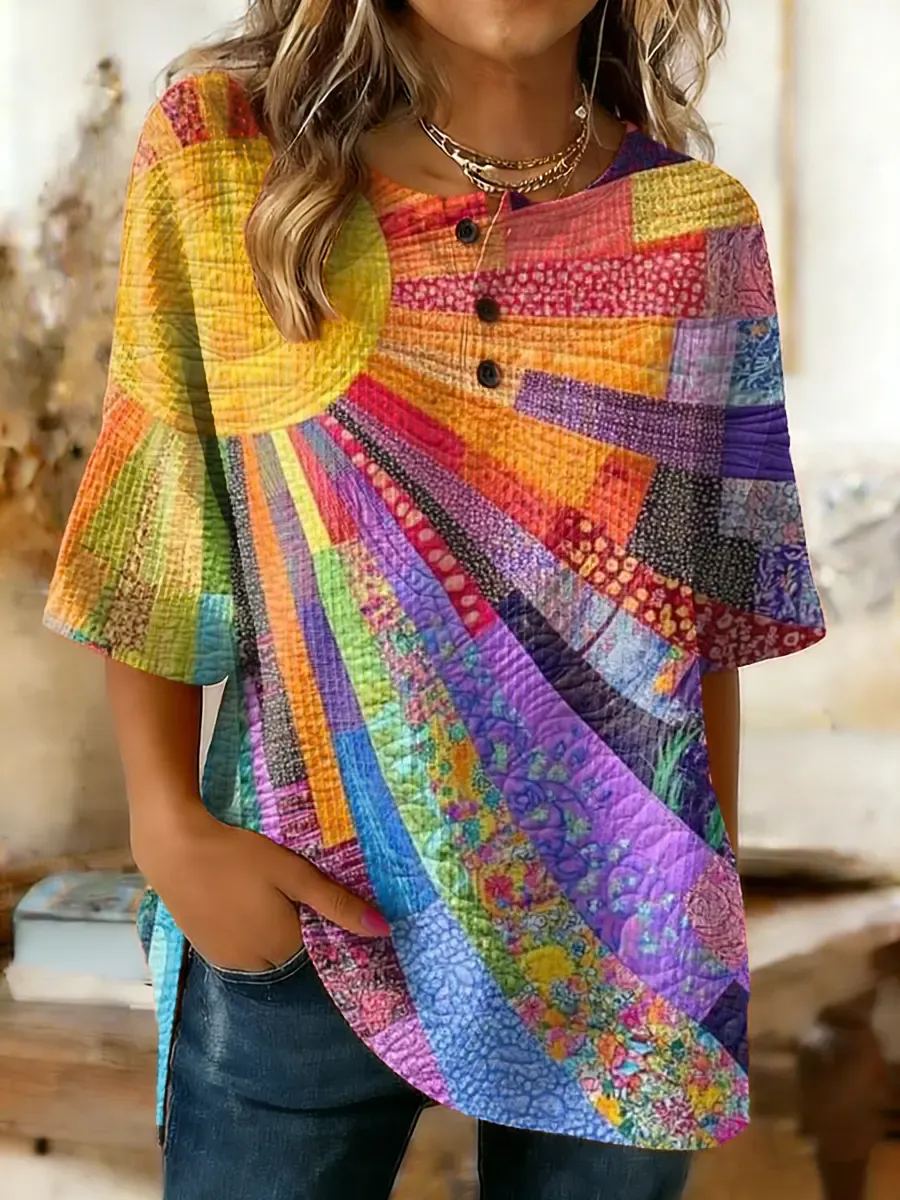 Women's Colorful Sun Patchwork Art Print Button-Up Short-Sleeve Loose Top