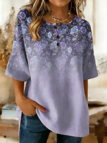 Women's Floral Art Print Button-Up Short-Sleeve Loose Top
