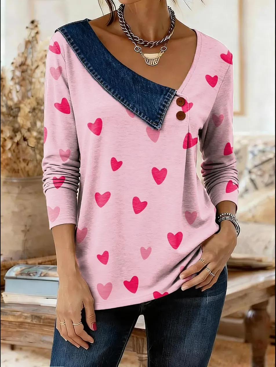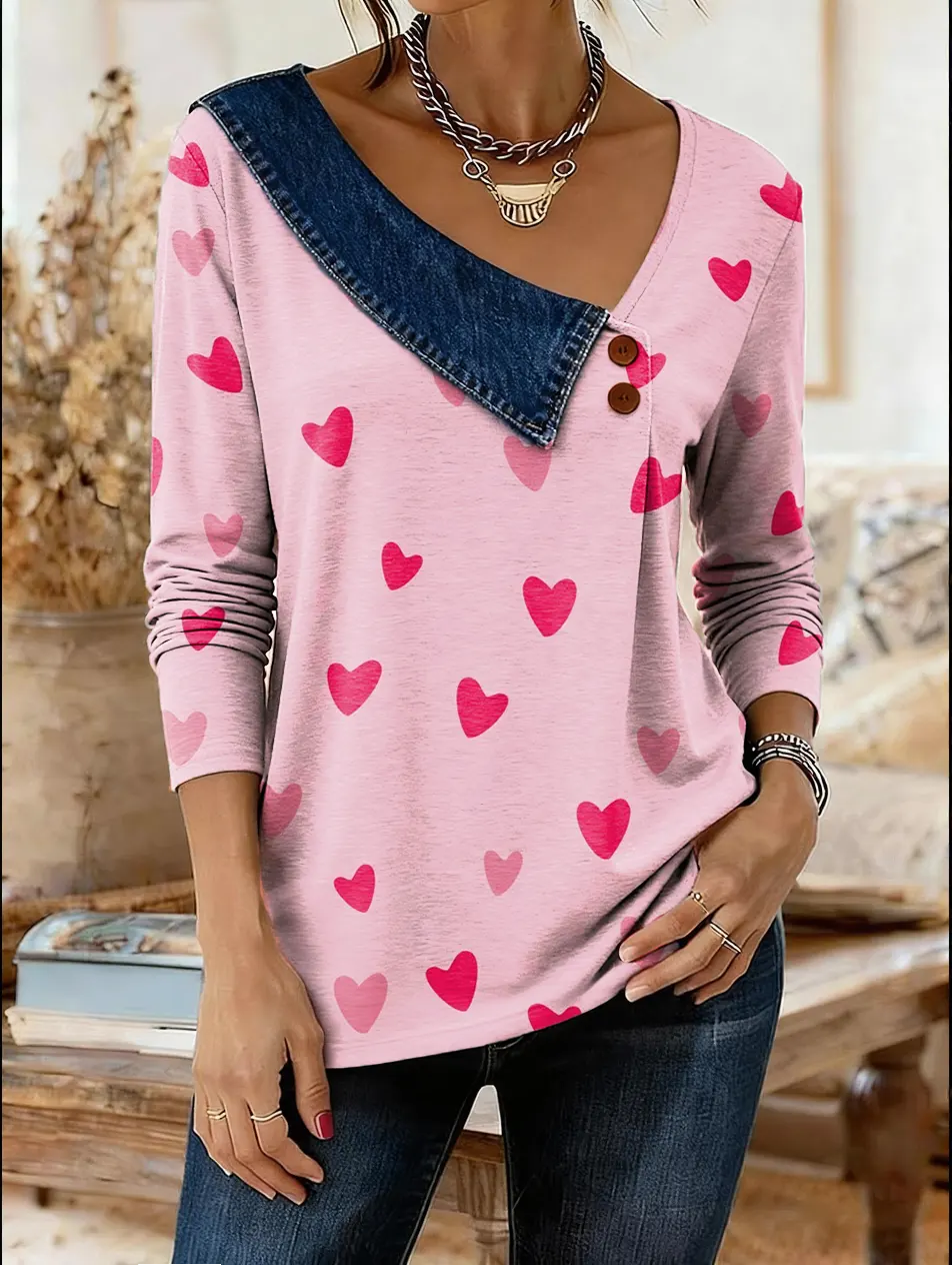 Women's Pink Heart-patterned Art Print Denim Collared Top