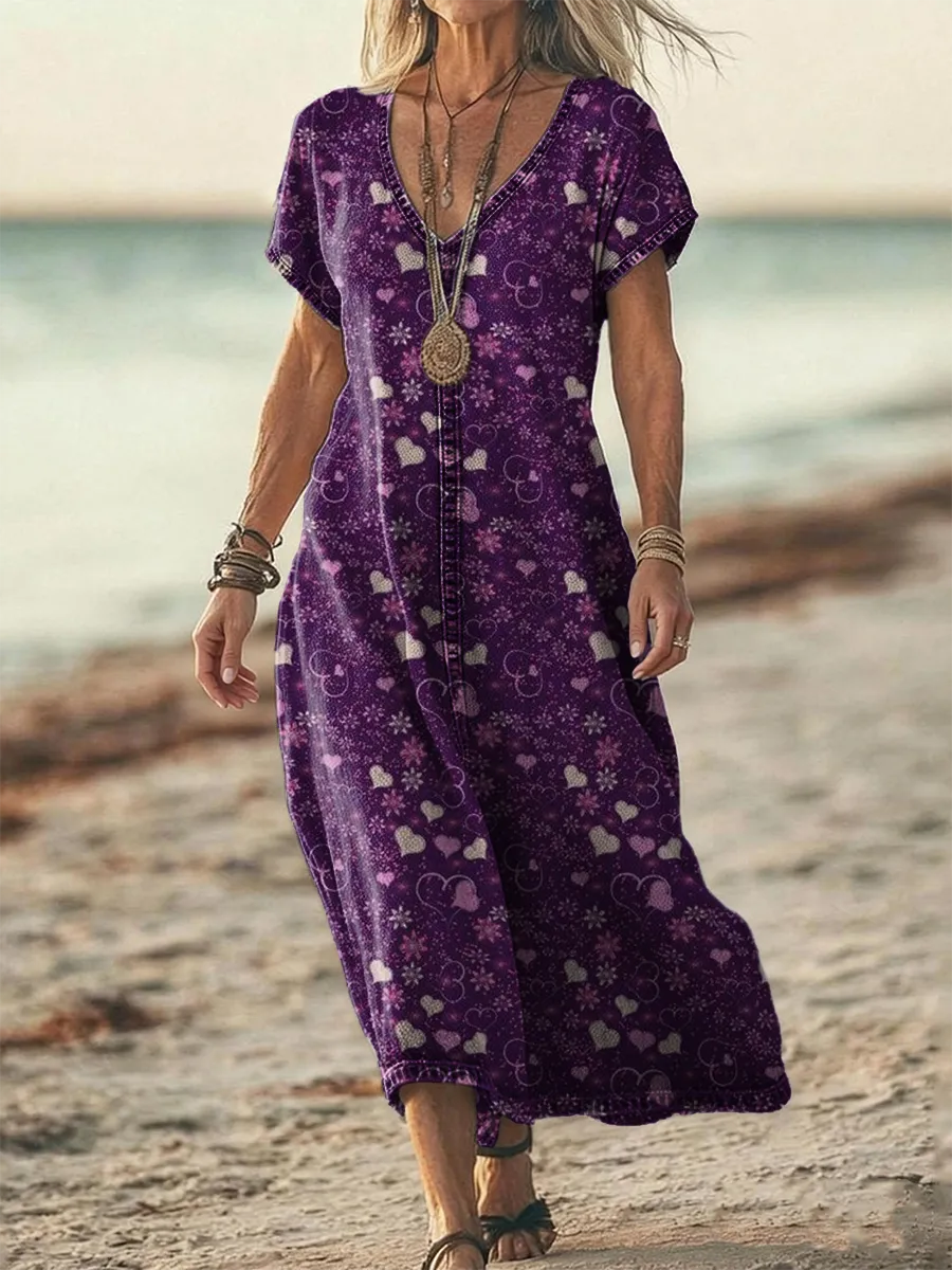 Women's Retro Heart Art Print Casual Short-Sleeve V-Neck Washed Cotton Denim Dress