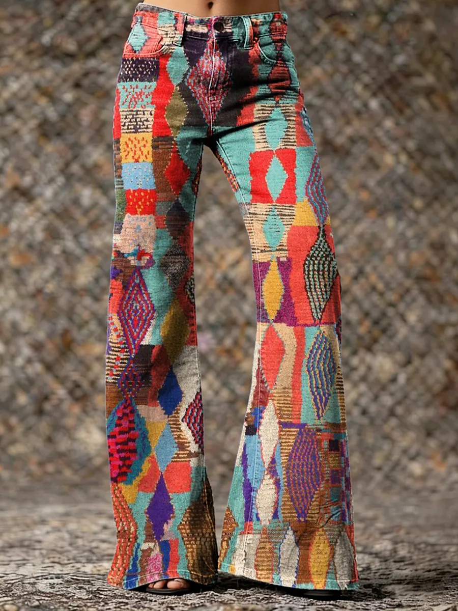Women's Vintage Bohemian Abstract Geometric Pattern Art Print Washed Denim Jeans