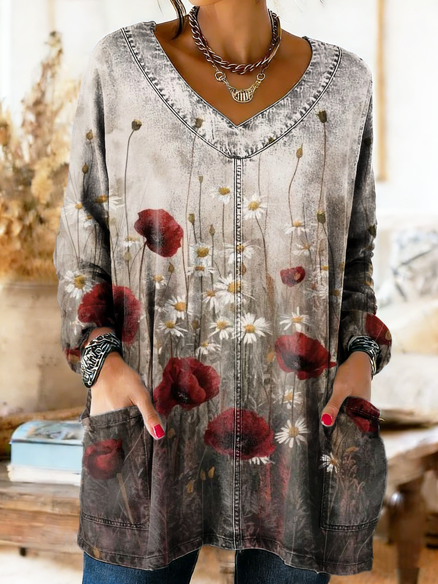 Women's Vintage Ethnic Floral Art Print Casual V-neck Pocket Long Sleeve Washed Denim Shirt
