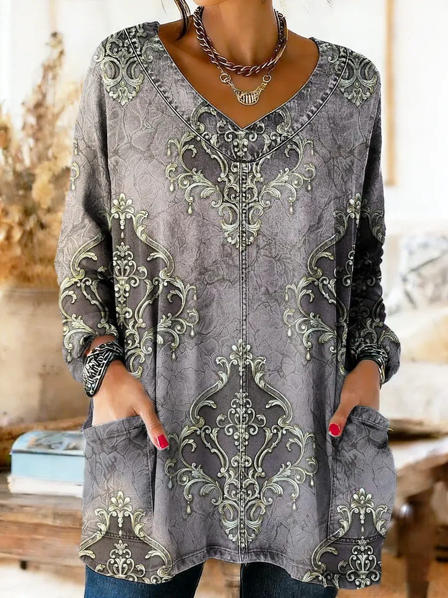 Women's Vintage Ethnic Textured Floral Art Print Casual V-neck Pocket Long Sleeve Washed Denim Shirt