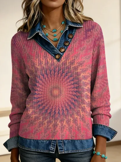 Women's Vintage Pink Kaleidoscope Art Print V-neck Denim Patchwork Knit Top