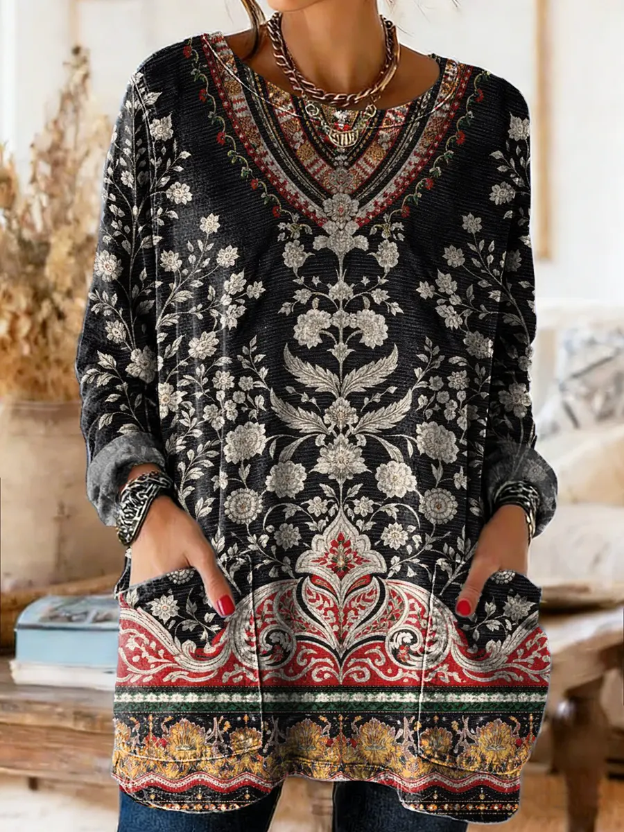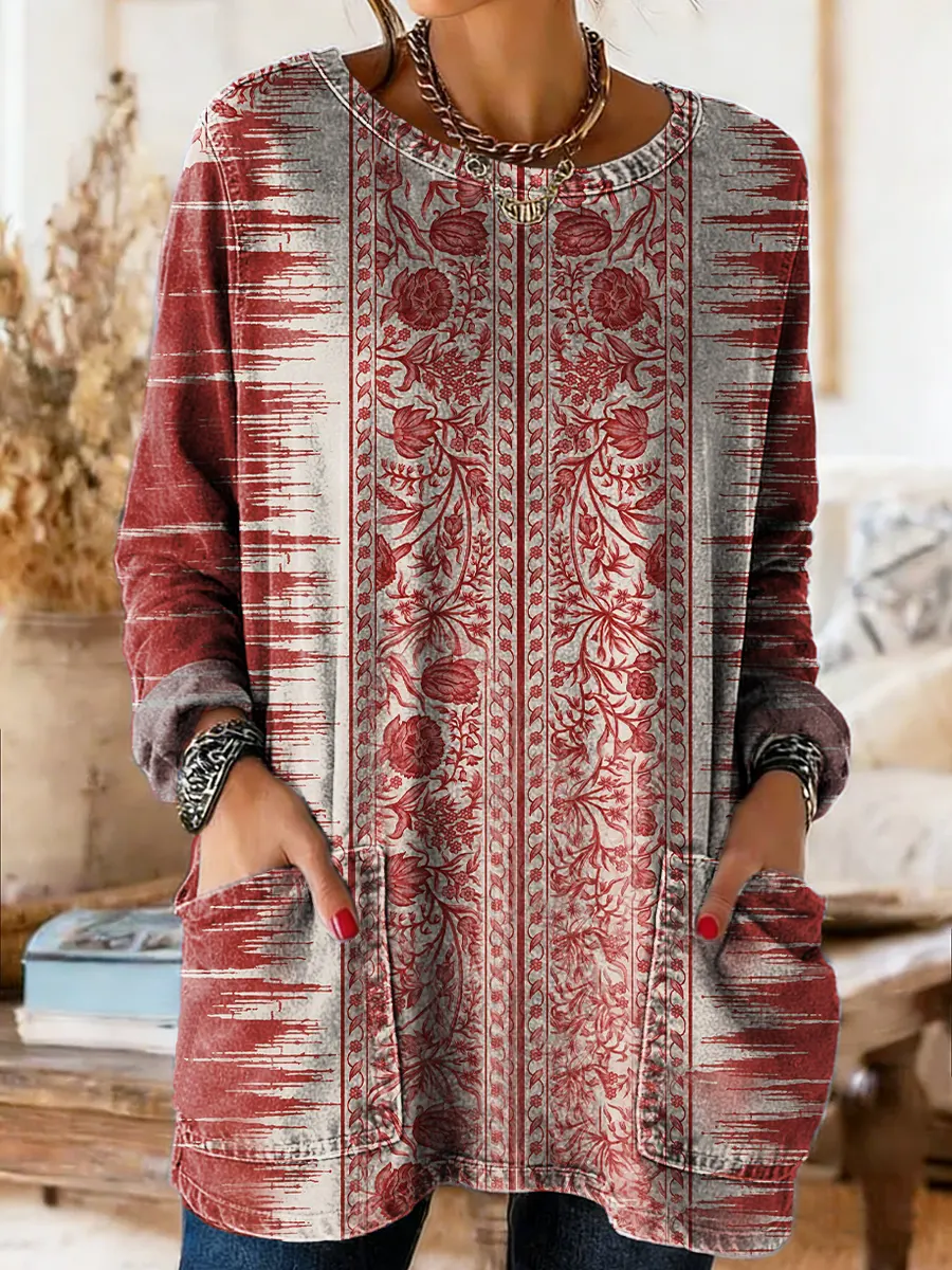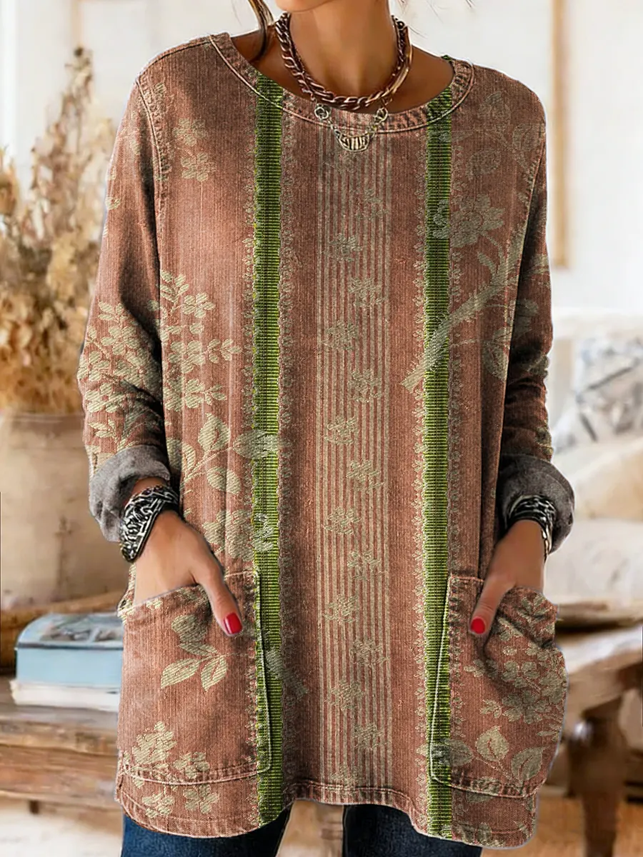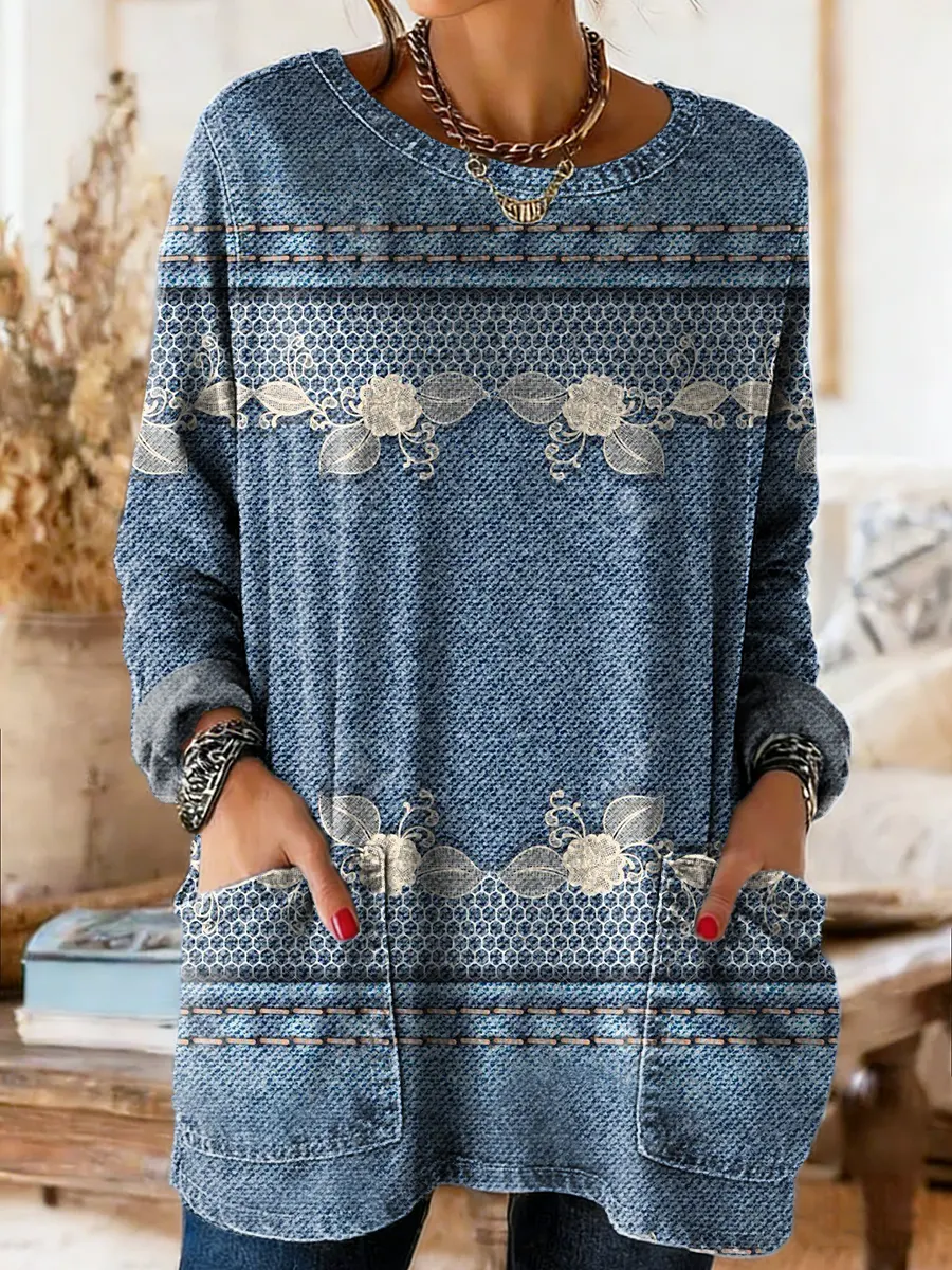 Women's Vintage Ethnic Floral Art Print Casual Long-sleeve Crew Neck Pocket Cotton Denim T-shirt