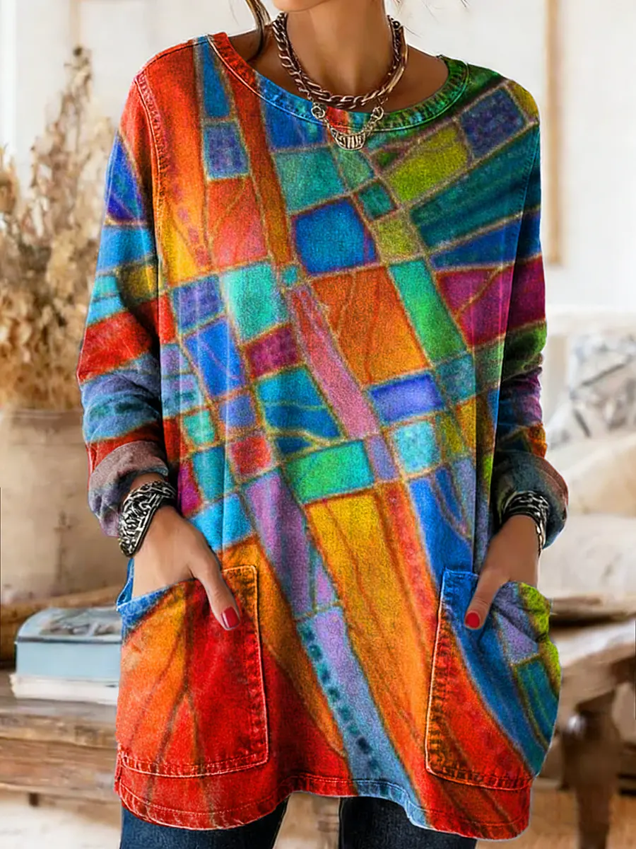 Women's Retro Colorful Art Print Casual Long Sleeve V-neck Washed Cotton Denim And Knitwear Combination T-shirt