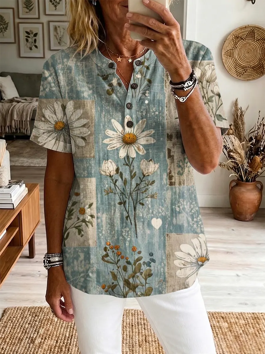Women's Short-sleeve Cotton-linen Blouse With Floral Patchwork Artistic Print And Cutout Details