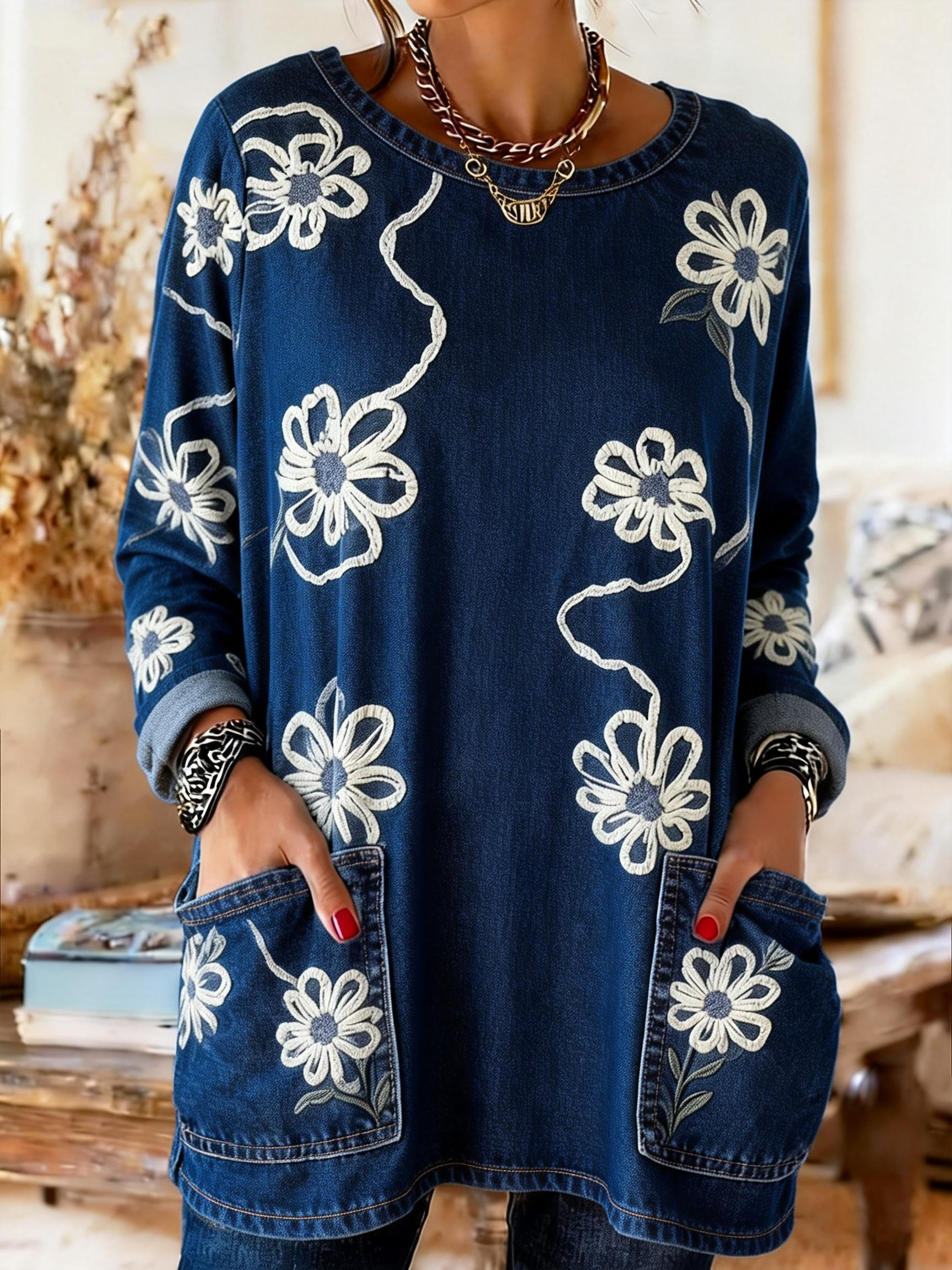 Women's Retro Floral Art Print Casual Long-Sleeved Round Neck Pocket Washed Cotton Denim Top