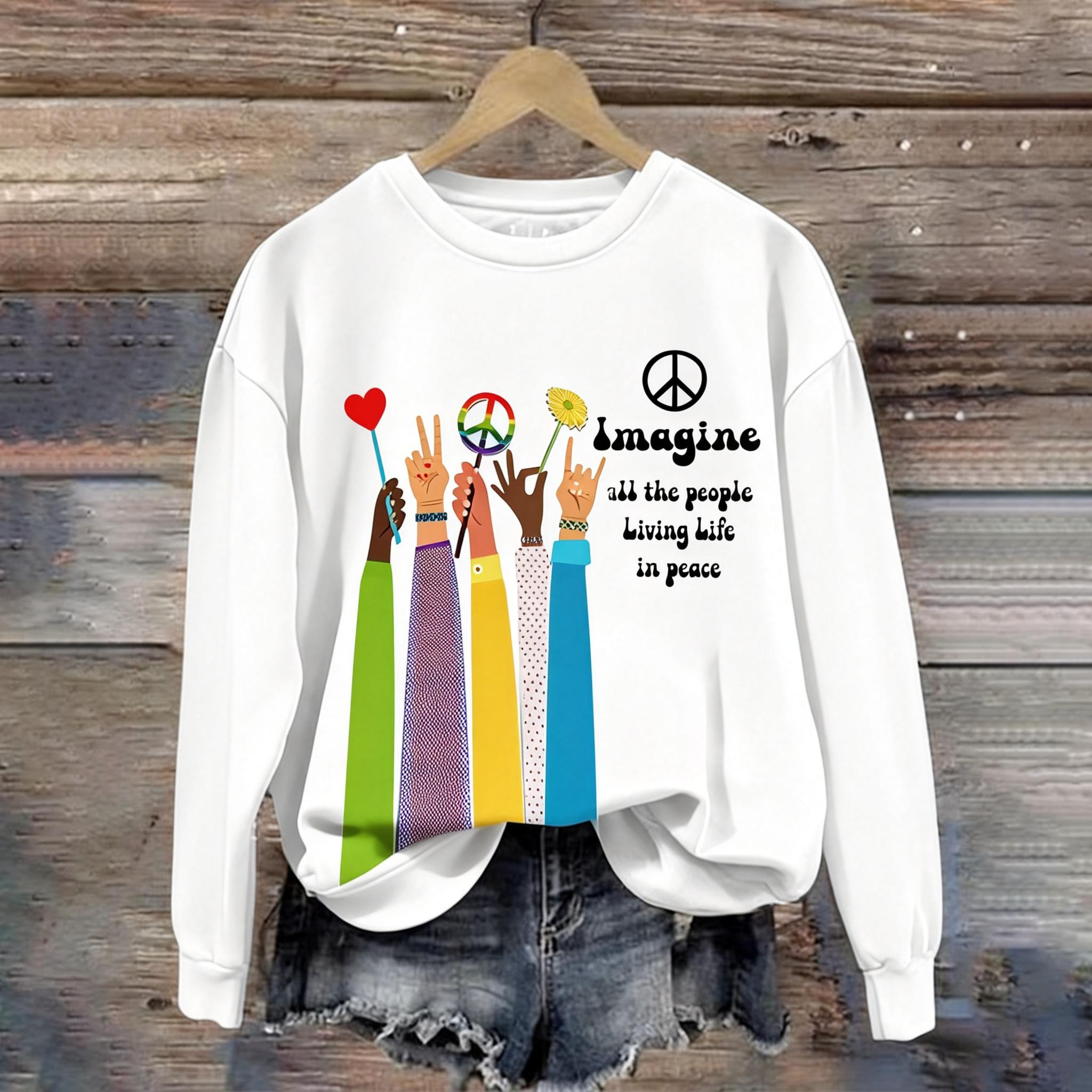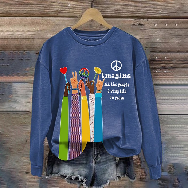 Retro Hippie Imagine All The People Living Life In Peace Print Sweatshirt