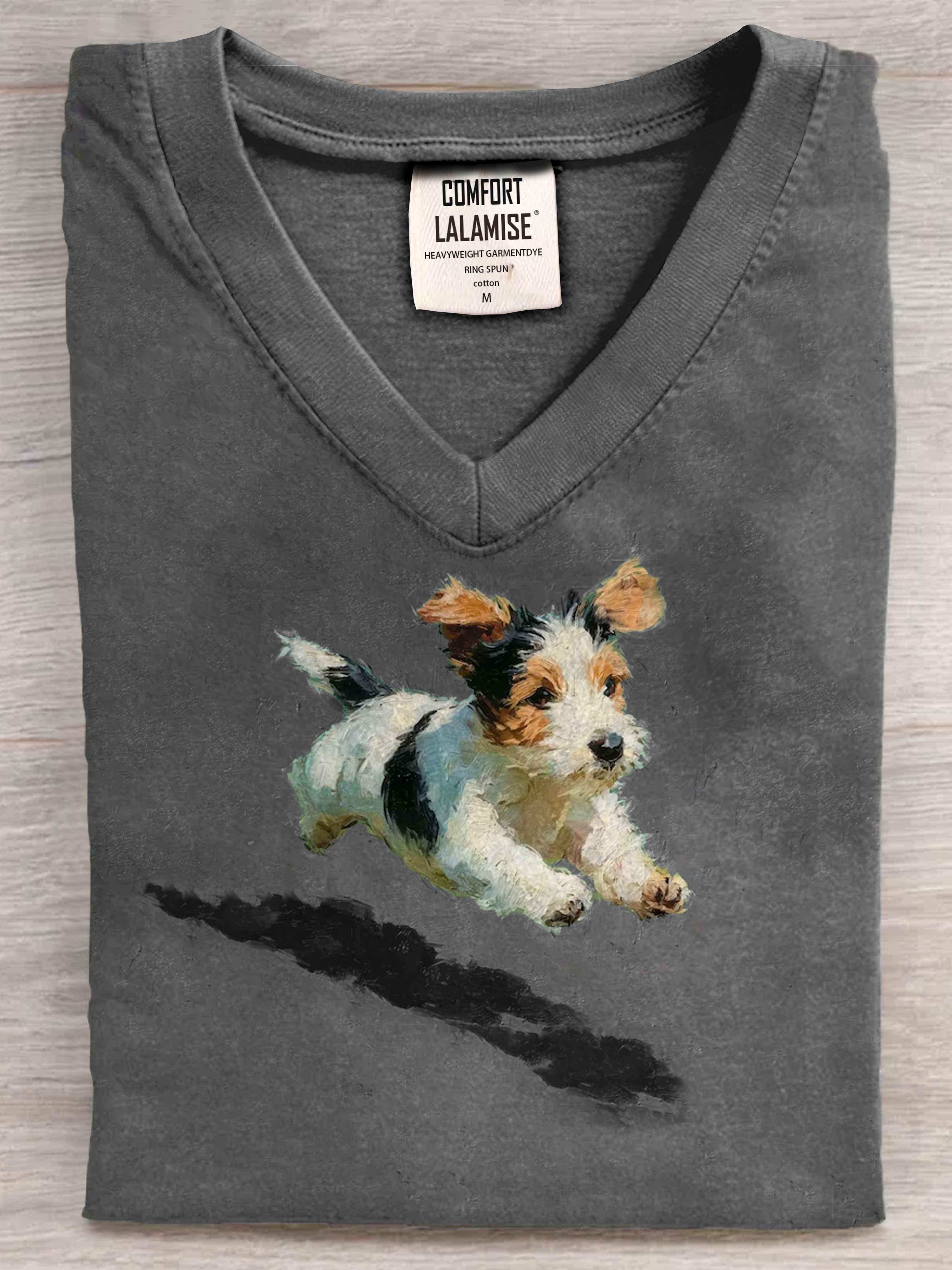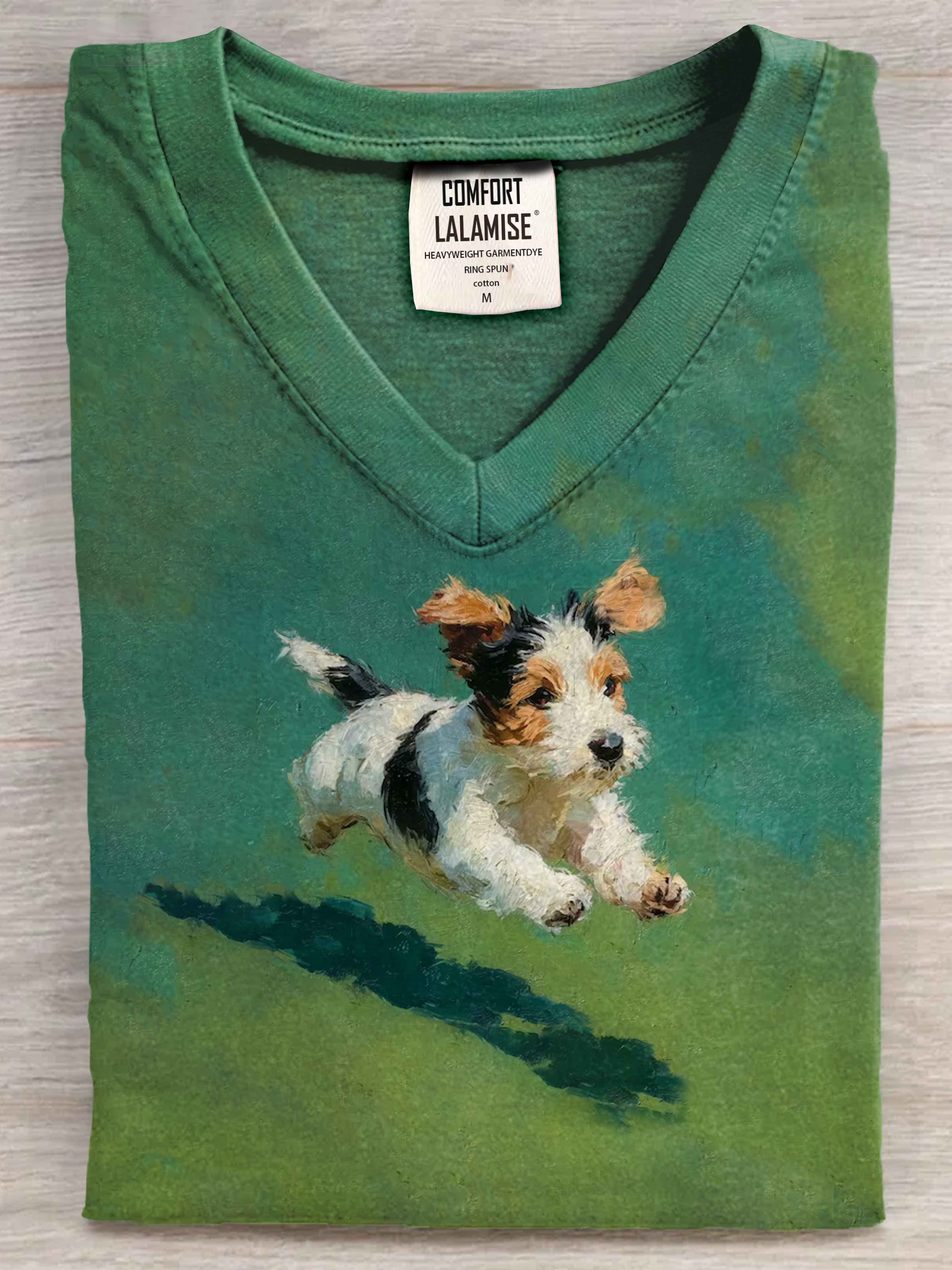 Funny Cute Running Dog Art Print V-neck Casual T-shirt
