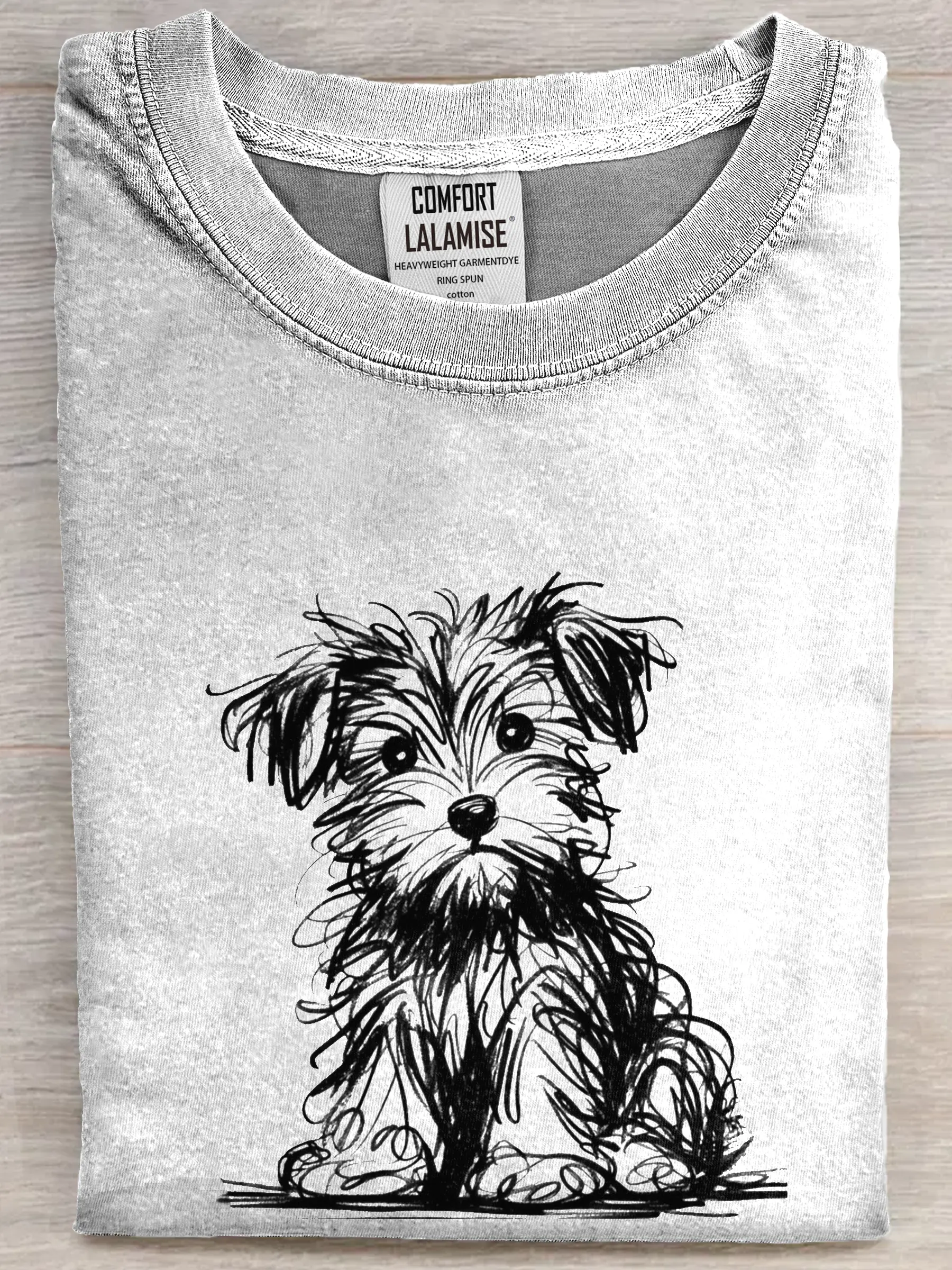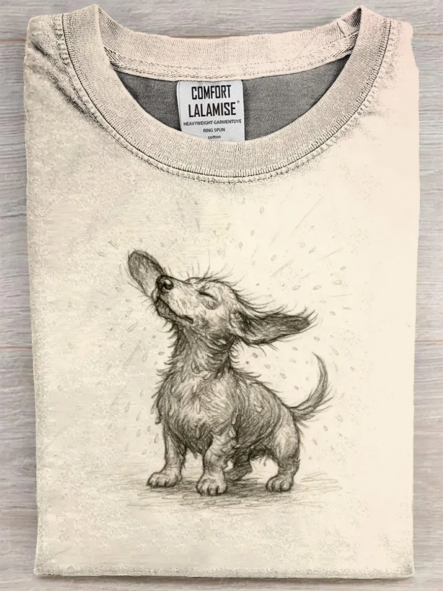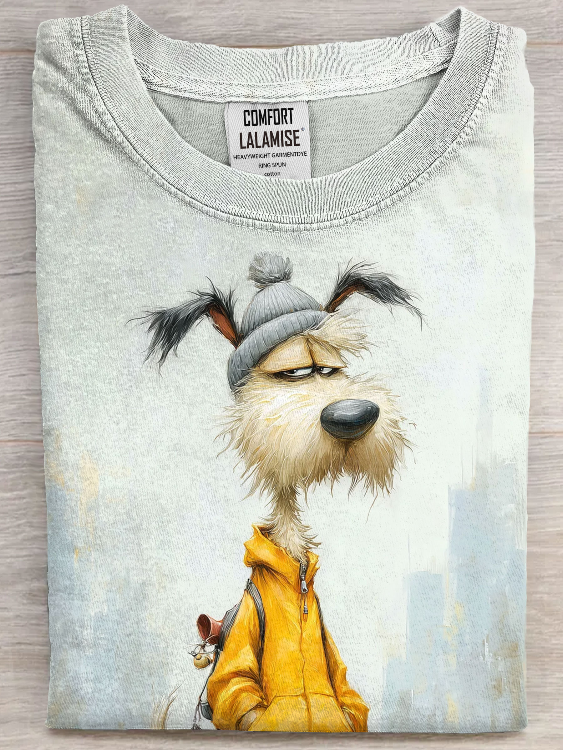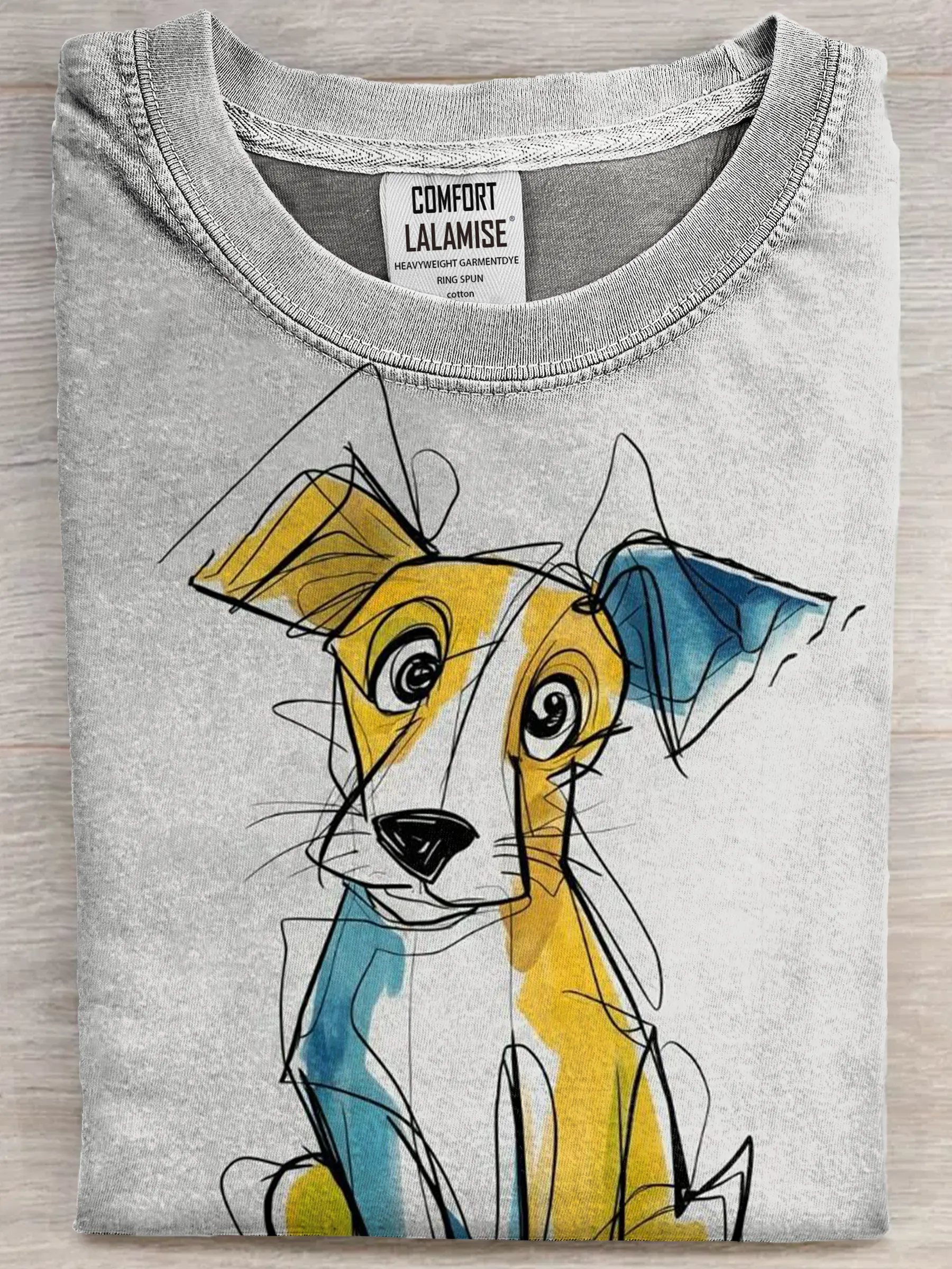 Retro Cute Dog Fun Art Print Casual Pure Cotton Short Sleeved T-shirt